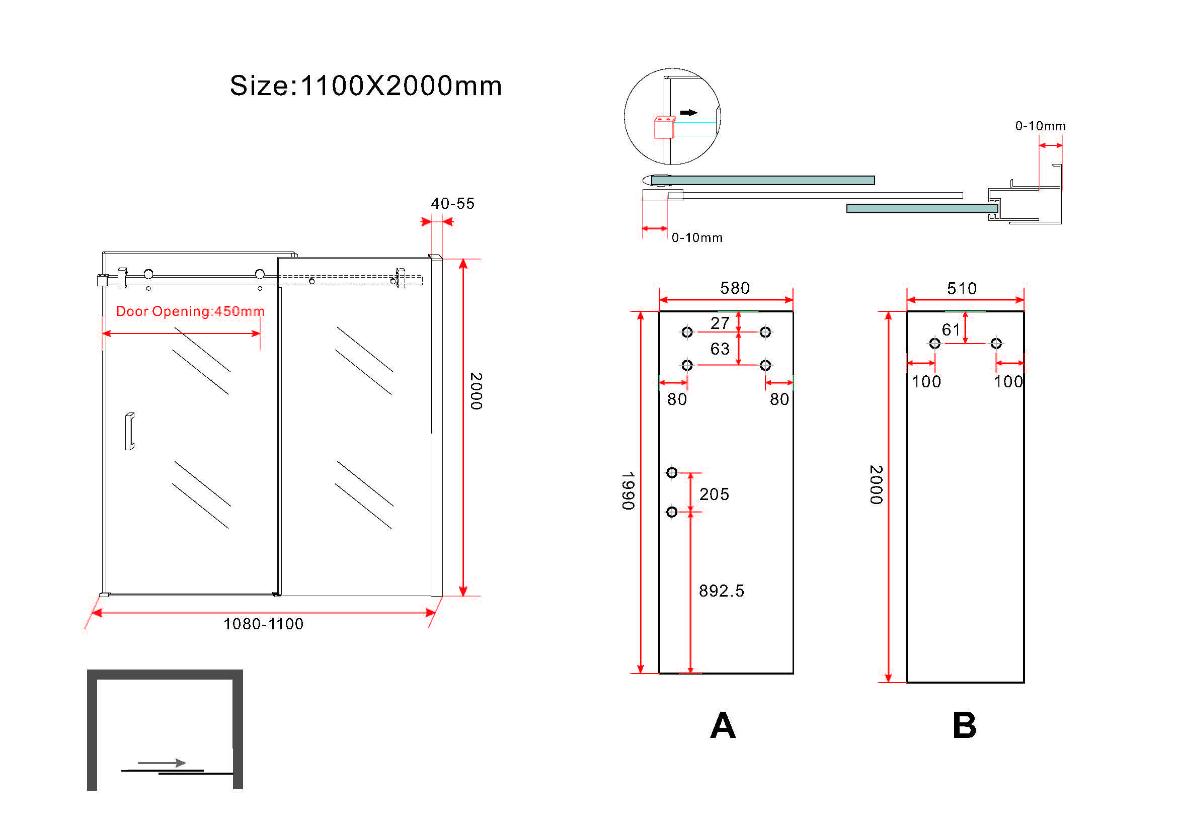 Wiesbaden Slide nis schuifdeur 1100 x 2000 x 8 mm nano helder glas/mat zwart