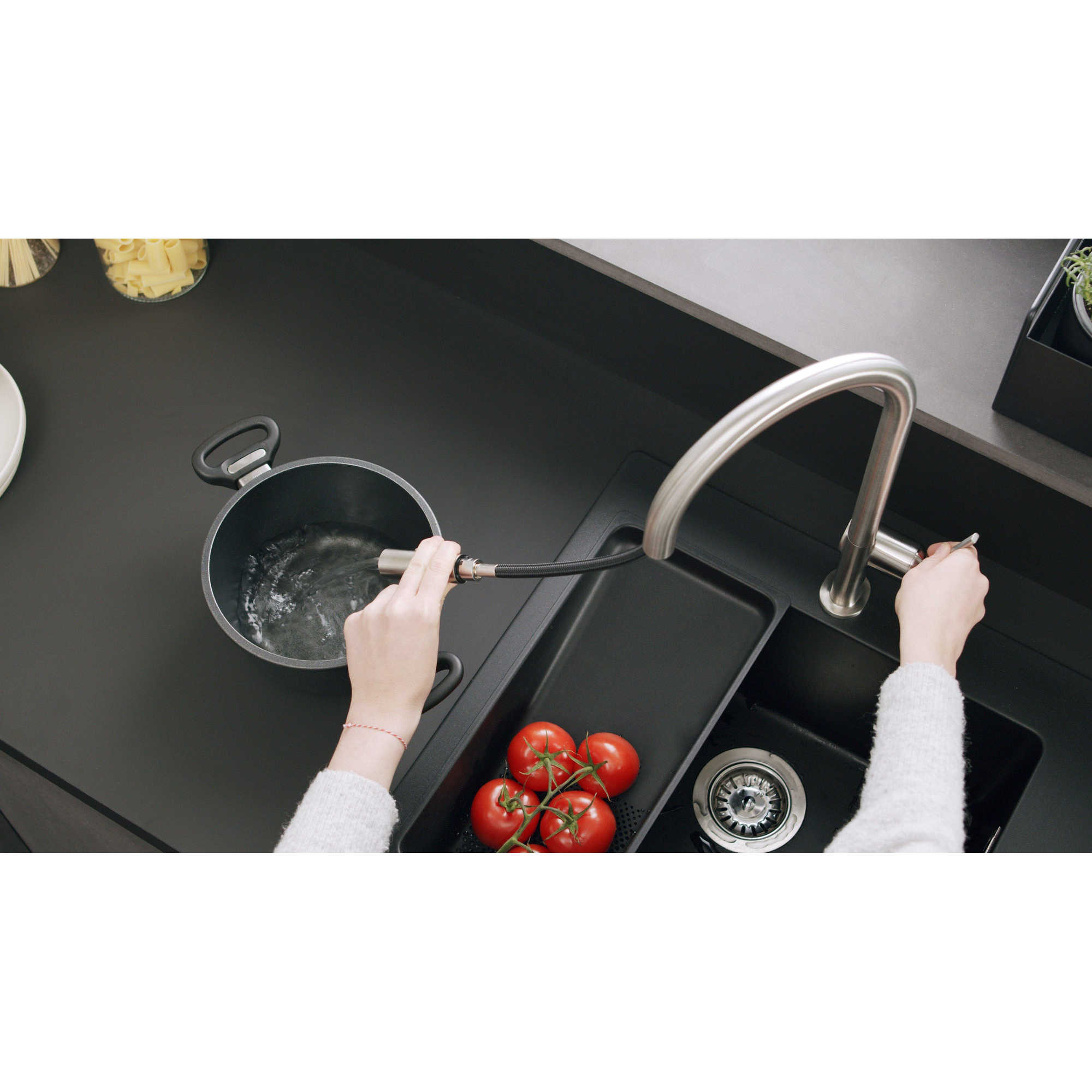 - Hoge, ronde uitloop met ComfortZone van 210 mm, ideaal voor grote spoelbakken en kookeilanden