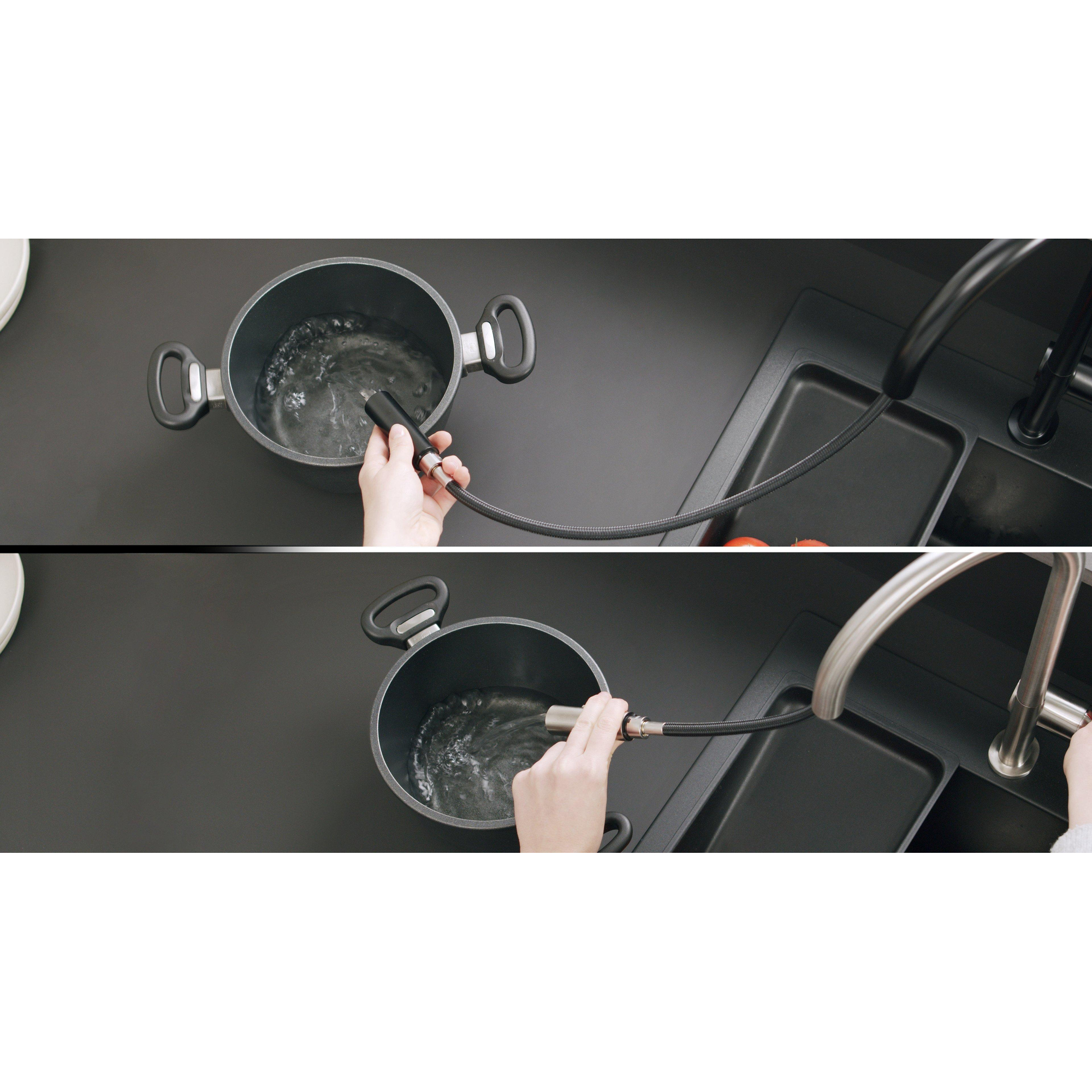 Met deze keukenmengkraan geef je jouw keuken een stijlvolle en praktische upgrade. Het minimalistische ontwerp met een robuuste roestvrijstalen look zorgt niet alleen voor een moderne uitstraling, maar ook voor een duurzame en krasbestendige afwerking die jarenlang meegaat. Dankzij de hoge, ronde uitloop en de uittrekbare vuistdouche werk je moeiteloos, of je nu grote pannen vult of groenten afspoelt. De twee verschillende straalsoorten bieden precies de juiste waterstroom voor elke klus, terwijl de soepele bediening en het slimme magnetische terugplaatsingssysteem van de douchekop het gebruiksgemak verhogen. Deze kraan is een perfecte combinatie van elegantie en functionaliteit, waardoor je keuken niet alleen mooier wordt, maar ook efficiënter in gebruik.