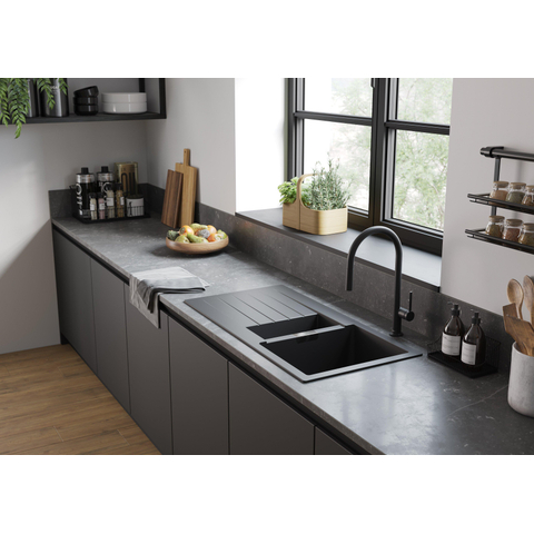 Deze kraan is een toonbeeld van modern minimalisme met een strakke, matzwarte afwerking die moeiteloos past in elke eigentijdse keuken. Het slanke silhouet en de hoge, gebogen uitloop creëren een elegante uitstraling die zowel functioneel als visueel aantrekkelijk is. Door het expressieve contrast van de matzwarte kleur geef je jouw keuken een unieke en luxe uitstraling. Zo combineer je moeiteloos stijl met praktische bruikbaarheid, wat jouw keuken een echte eyecatcher maakt.