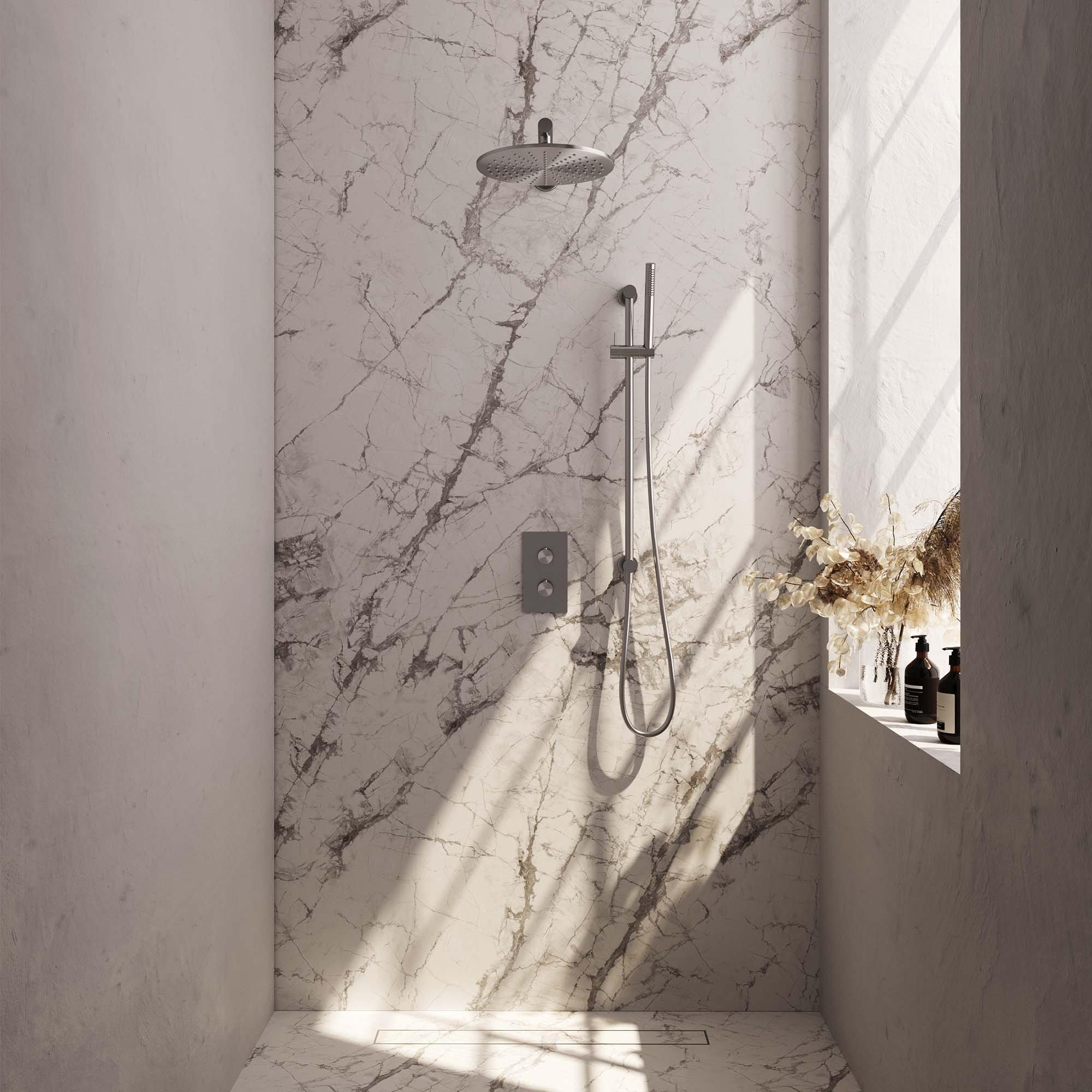 De Brauer Brushed Edition Regendoucheset inbouw is prachtig vormgegeven met aandacht voor detail. Het geborsteld RVS geeft een luxe uitstraling en past perfect bij moderne badkamerstijlen. De hoofddouche van 30cm zorgt voor een gelijkmatige waterverdeling, terwijl de handdouche Staaf 1 stand extra comfort biedt. Deze set voegt een vleugje elegantie toe aan elke badkamer.