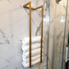 Wat een opvallend pronkstuk! Het rek is gemaakt van metaal en kent een mooi afwerking in een mat gouden kleur. Het handdoekrek kan in een badkamer geplaatst worden. maar past ook goed op zijn plaats in een slaapkamer. Het industriële rek heeft een hoogte van 95 cm. een breedte van 25 cm en een diepte van 20 cm. U kunt de handdoeken oprollen of opvouwen.