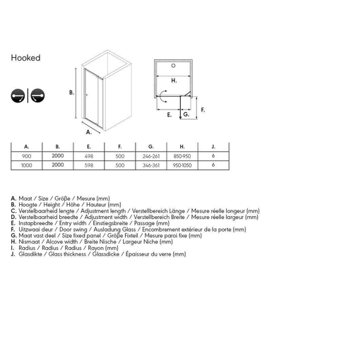 Deze draaideur voor plaatsing in een nis van 90 cm uit de serie Hooked past vrijwel altijd. Hij heeft namelijk een verstelbaarheid van maar liefst 10 cm. Als je muur niet waterpas staat of als je net niet goed uitkomt met een gewone cabine, dan kan je deze toch installeren.