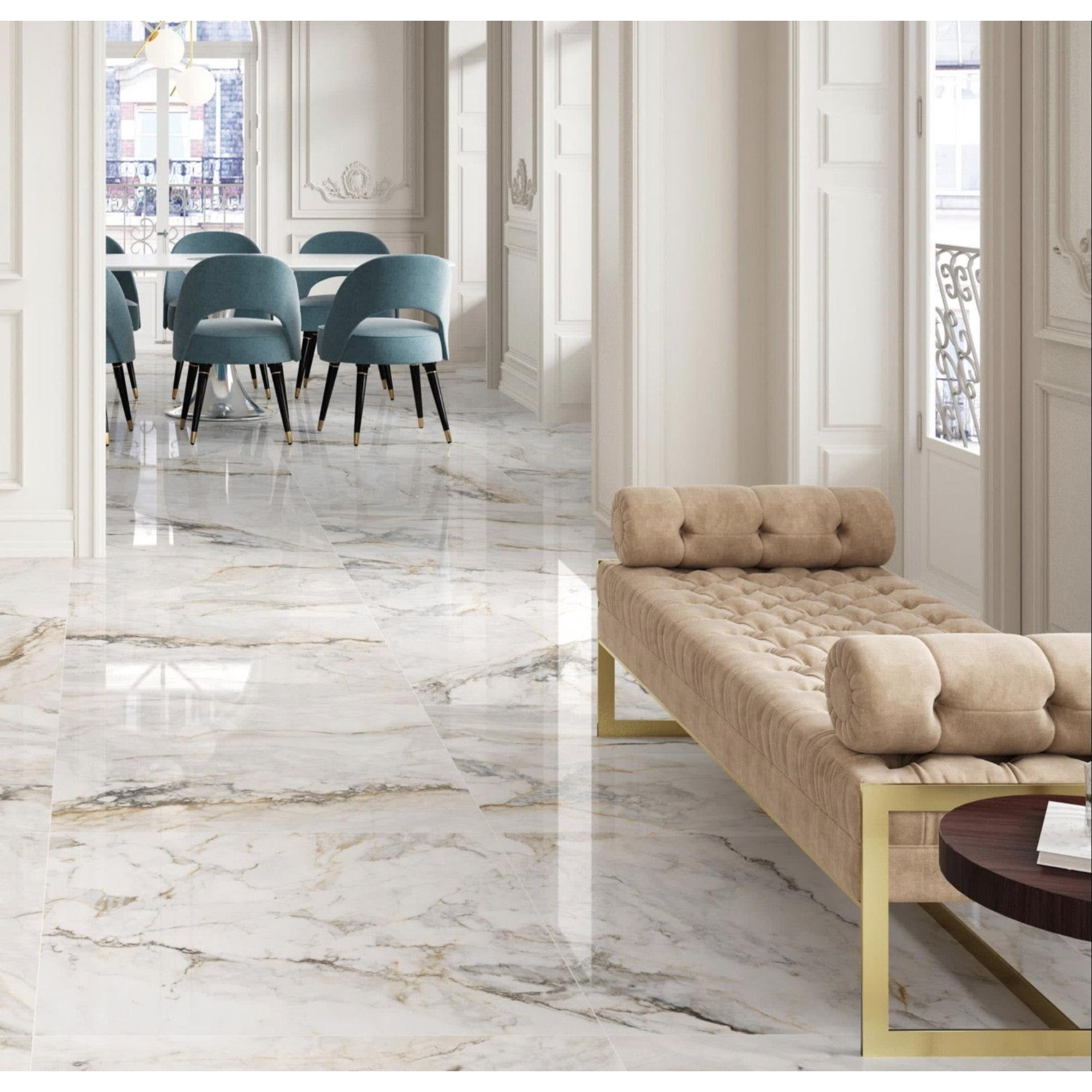 Deze tegel straalt pure elegantie uit en past perfect bij zowel moderne als klassieke interieurstijlen. De marmerachtige textuur en glanzende afwerking geven een gevoel van tijdloze schoonheid. De tegel is geschikt voor zowel residentiële als commerciële toepassingen en creëert een sfeer van verfijning en klasse.