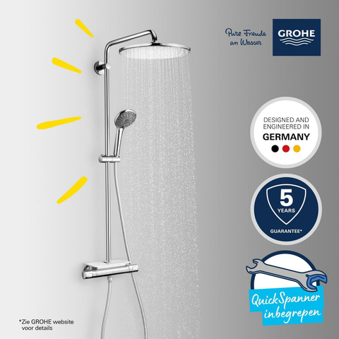 Met een hoogwaardige, krasbestendige chroomlaag en innovatieve technologieën zoals het anti-kalk SpeedClean-systeem, blijft dit douchesysteem er jarenlang als nieuw uitzien. De duurzame materialen en de Duitse kwaliteit zorgen ervoor dat je jarenlang zorgeloos kunt genieten van je douche. Bovendien draagt de waterbesparende technologie bij aan een milieuvriendelijke douchebeleving, zonder dat je inlevert op comfort of waterdruk. Zo investeer je in een product dat niet alleen goed is voor jou, maar ook voor het milieu.
