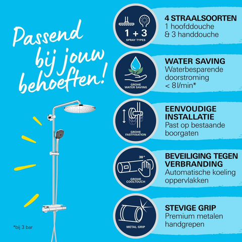 De geavanceerde thermostaat met GROHE TurboStat-technologie garandeert een constante watertemperatuur, zelfs bij schommelingen in de watertoevoer. Dit zorgt voor extra comfort en veiligheid, vooral in huishoudens met kinderen dankzij de SafeStop-functie die de temperatuur beperkt tot 38°C. Met de AquaDimmer schakel je moeiteloos tussen de hoofddouche en handdouche, terwijl de drie straalsoorten van de handdouche – Rain, Massage en SmartRain – je de vrijheid geven om je douche-ervaring helemaal naar wens aan te passen. De draaibare douchearm en het flexibele ontwerp maken het gebruik bovendien extra comfortabel en praktisch.