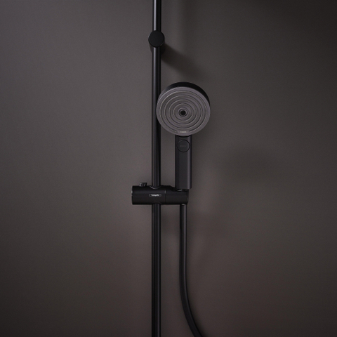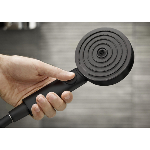 Het tijdloze, ronde ontwerp in mat zwart maakt van deze handdouche een echte blikvanger in je badkamer. De grafietkleurige straalplaat en de ringvormige straalopeningen geven een subtiele, maar krachtige uitstraling die past bij uiteenlopende interieurstijlen. Dit stijlvolle element zorgt ervoor dat je badkamer er direct modern en verzorgd uitziet. Bovendien blijft de matzwarte afwerking mooi en is eenvoudig schoon te houden, zodat je badkamer altijd fris oogt zonder veel moeite.