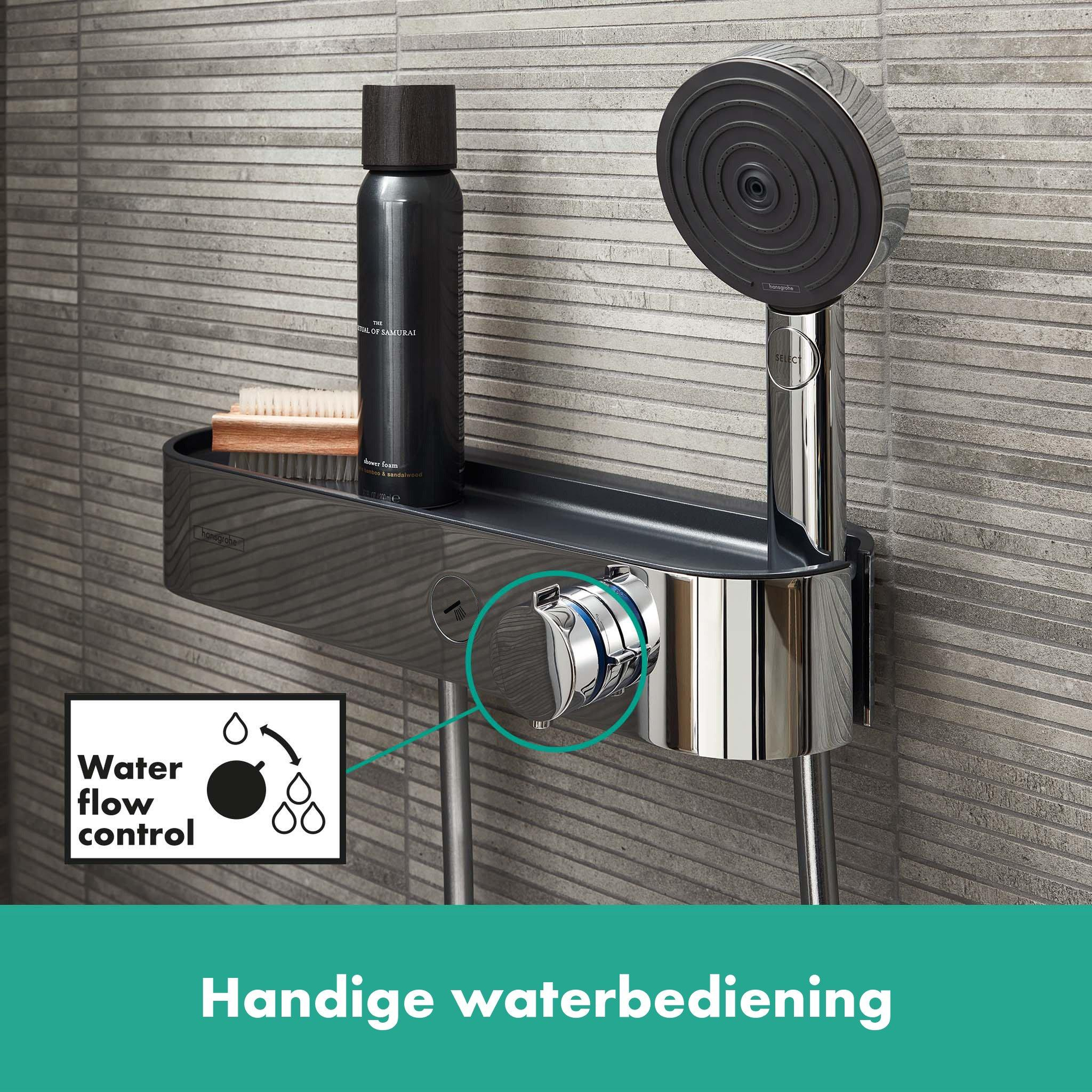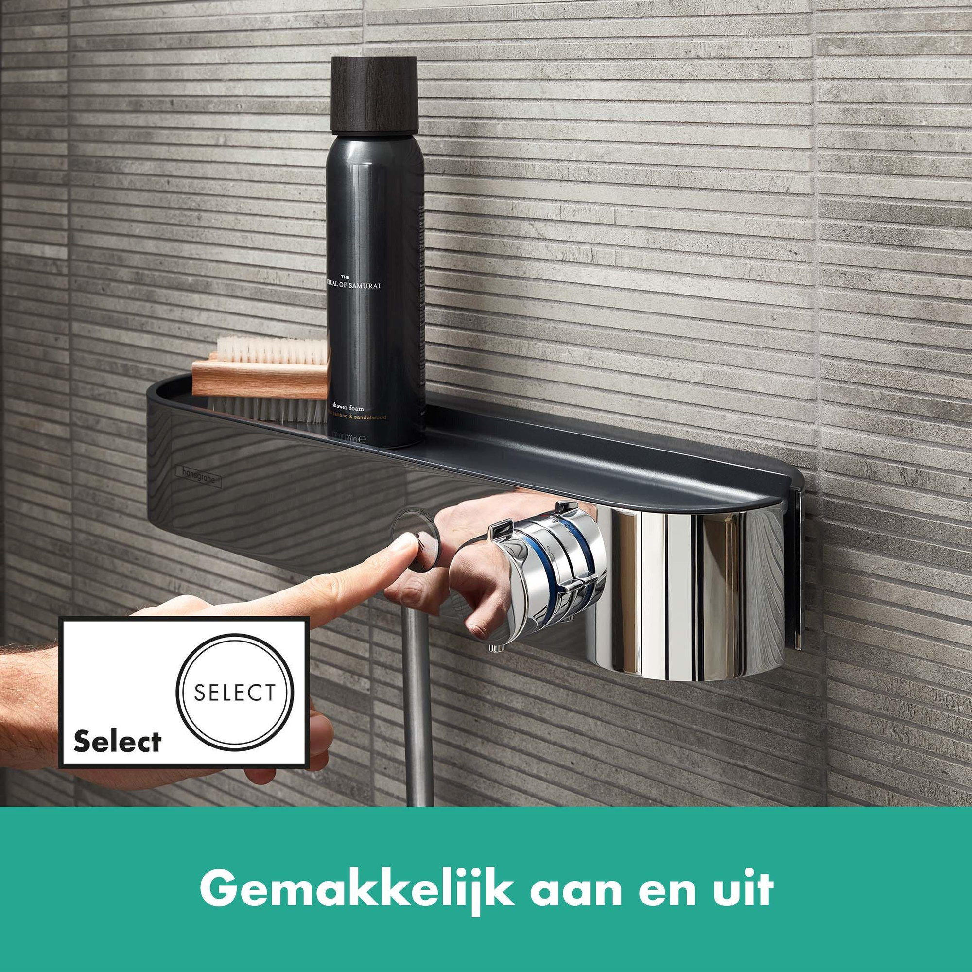 Met drie verschillende straalsoorten – van zachte PowderRain tot stimulerende IntenseRain en een weldadige massagestraal – pas je de douche aan naar jouw stemming en behoefte. De Select-knoppen maken het aan- en uitzetten van de douche net zo eenvoudig als het bedienen van een lichtschakelaar. Daarnaast biedt het grote planchet op de thermostaat praktische ruimte voor je favoriete verzorgingsproducten, zodat alles binnen handbereik is. De glijstang van 90 cm zorgt voor flexibiliteit in hoogte, zodat iedereen comfortabel kan douchen.