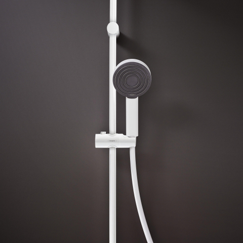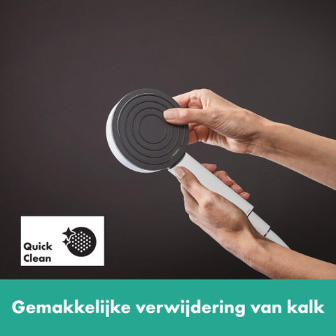 De ergonomische greep ligt comfortabel in de hand. Dankzij de interne watervoering wordt de buitenkant niet heet, zelfs niet tijdens lang douchen. Een uitspoelbare zeef zorgt voor een langdurige betrouwbare werking: Het vangt het vuil op voor het in de douchekop terecht kan komen. Nog een belangrijk voordeel: De expressieve finish in mat wit is eenvoudig te reinigen en blijft altijd mooi.