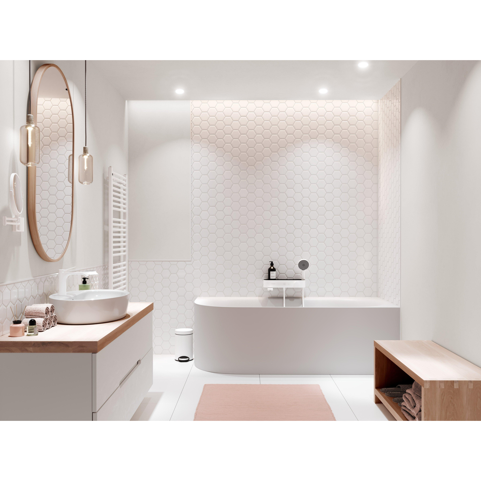 De mat witte afwerking geeft dit badthermostaat een moderne en tijdloze uitstraling die moeiteloos past in diverse badkamerstijlen. Het zachte, afgeronde design zorgt voor een elegante touch, terwijl het planchet met zijn royale afmeting niet alleen praktisch is, maar ook een visueel statement maakt. Door de subtiele kleur en het minimalistische ontwerp wordt jouw badkamer een plek waar rust en stijl samenkomen. Bovendien is de mat witte coating eenvoudig schoon te houden, waardoor je badkamer er altijd fris en verzorgd uitziet.