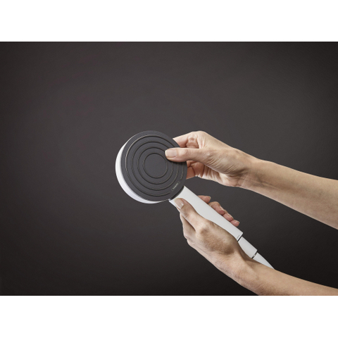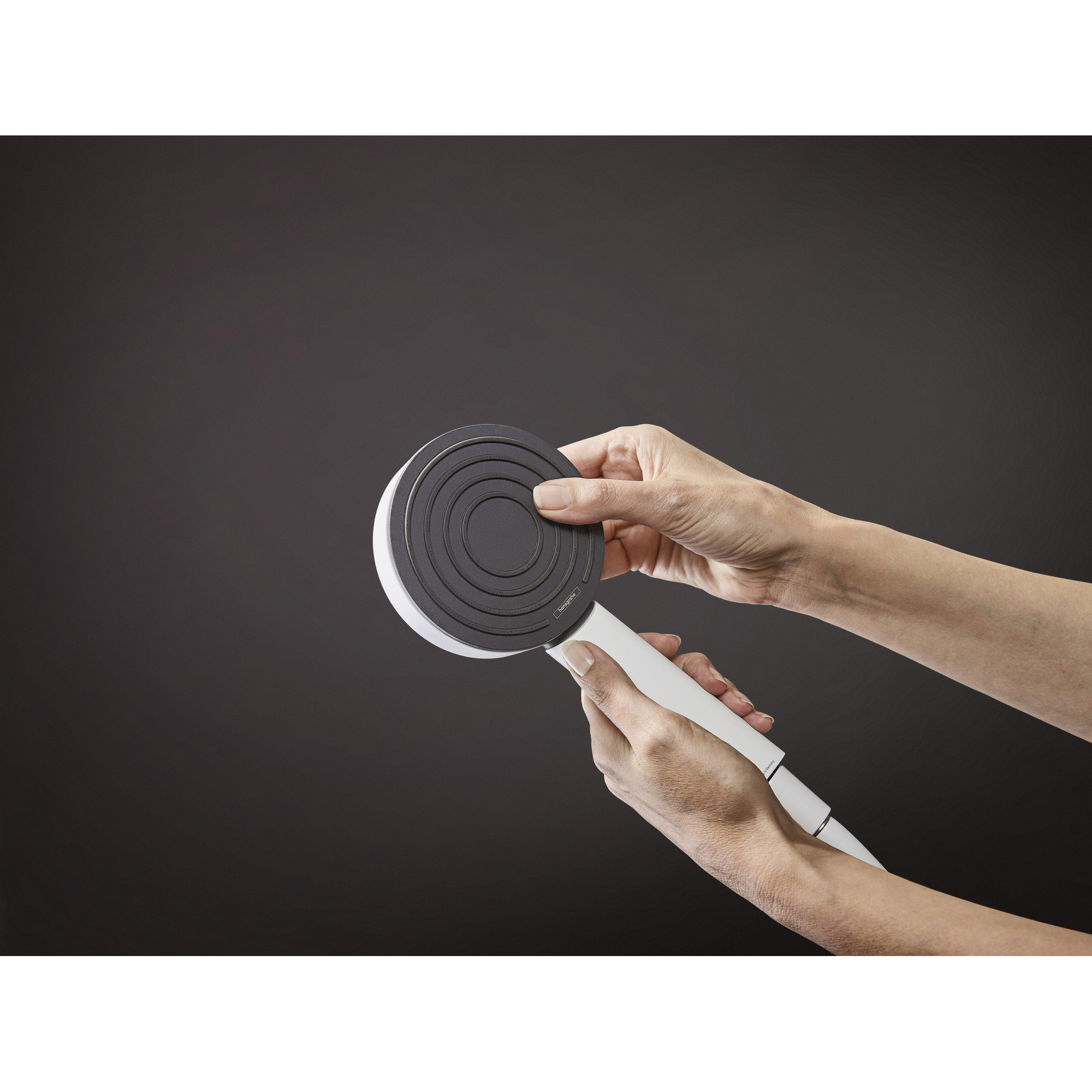 Deze handdouche valt direct op door zijn moderne, ronde vormgeving en de matte witte afwerking die elegantie uitstraalt. De subtiele grafietgrijze ring met straalopeningen geeft het geheel een unieke uitstraling die moeiteloos past in diverse badkamerstijlen. Het design is niet alleen mooi om te zien, maar ook praktisch: de strakke lijnen en het tijdloze kleurgebruik zorgen ervoor dat deze douchekop een blijvende eyecatcher is. Zo voeg je een stijlvol accent toe aan jouw badkamer, dat zowel functioneel als visueel overtuigt.
