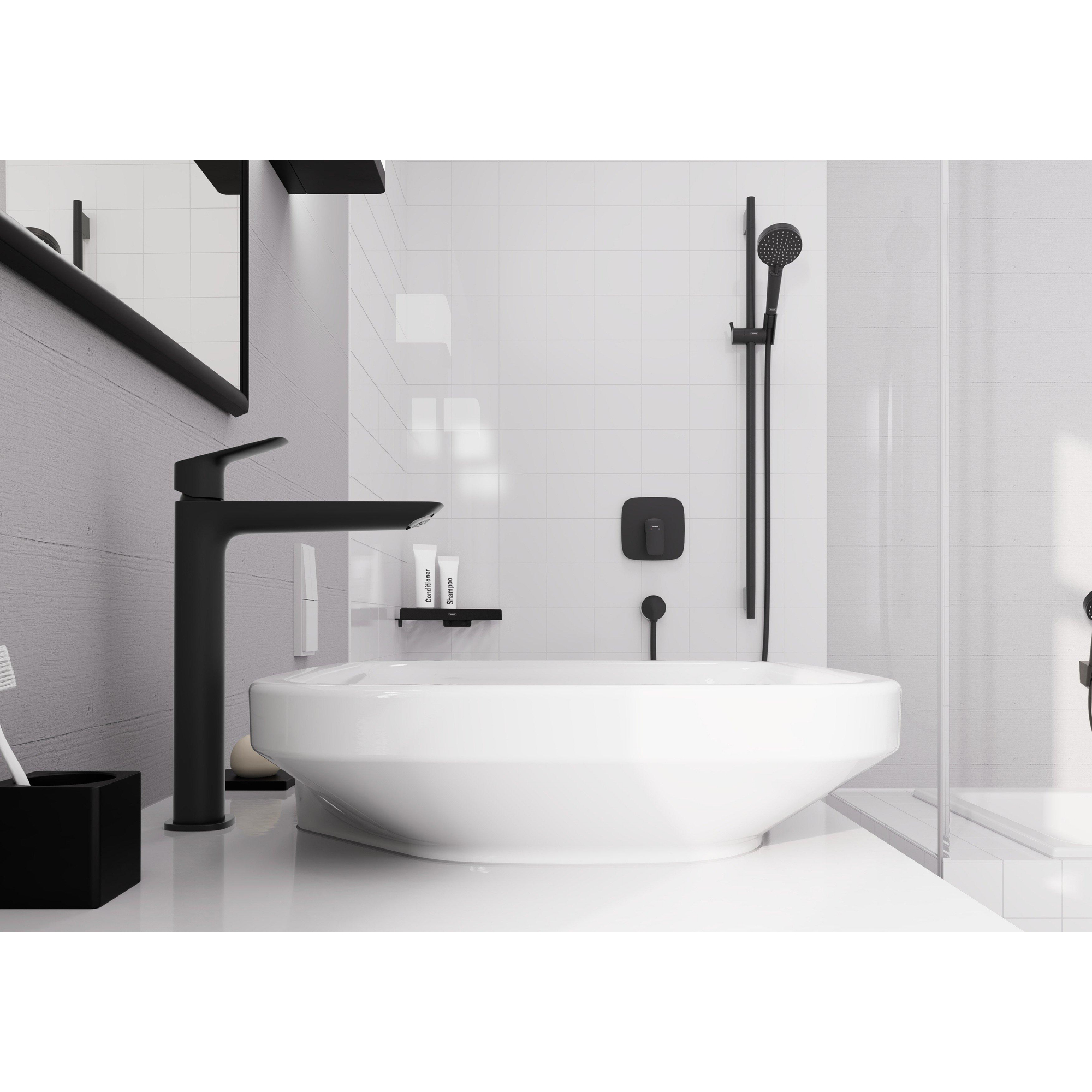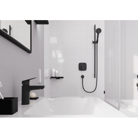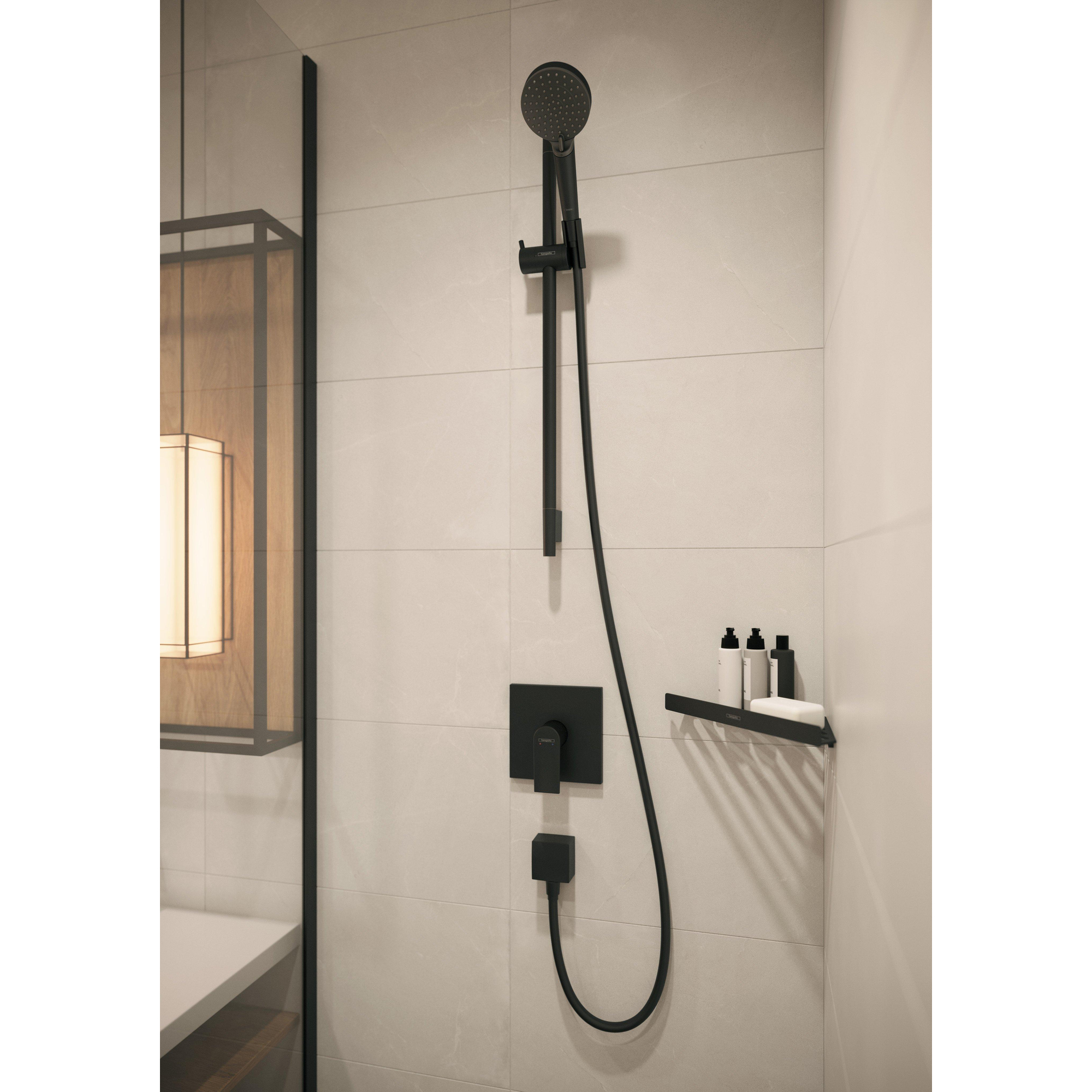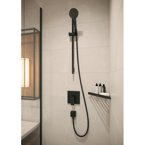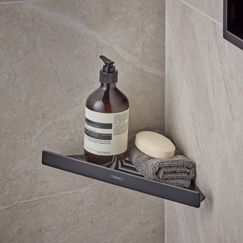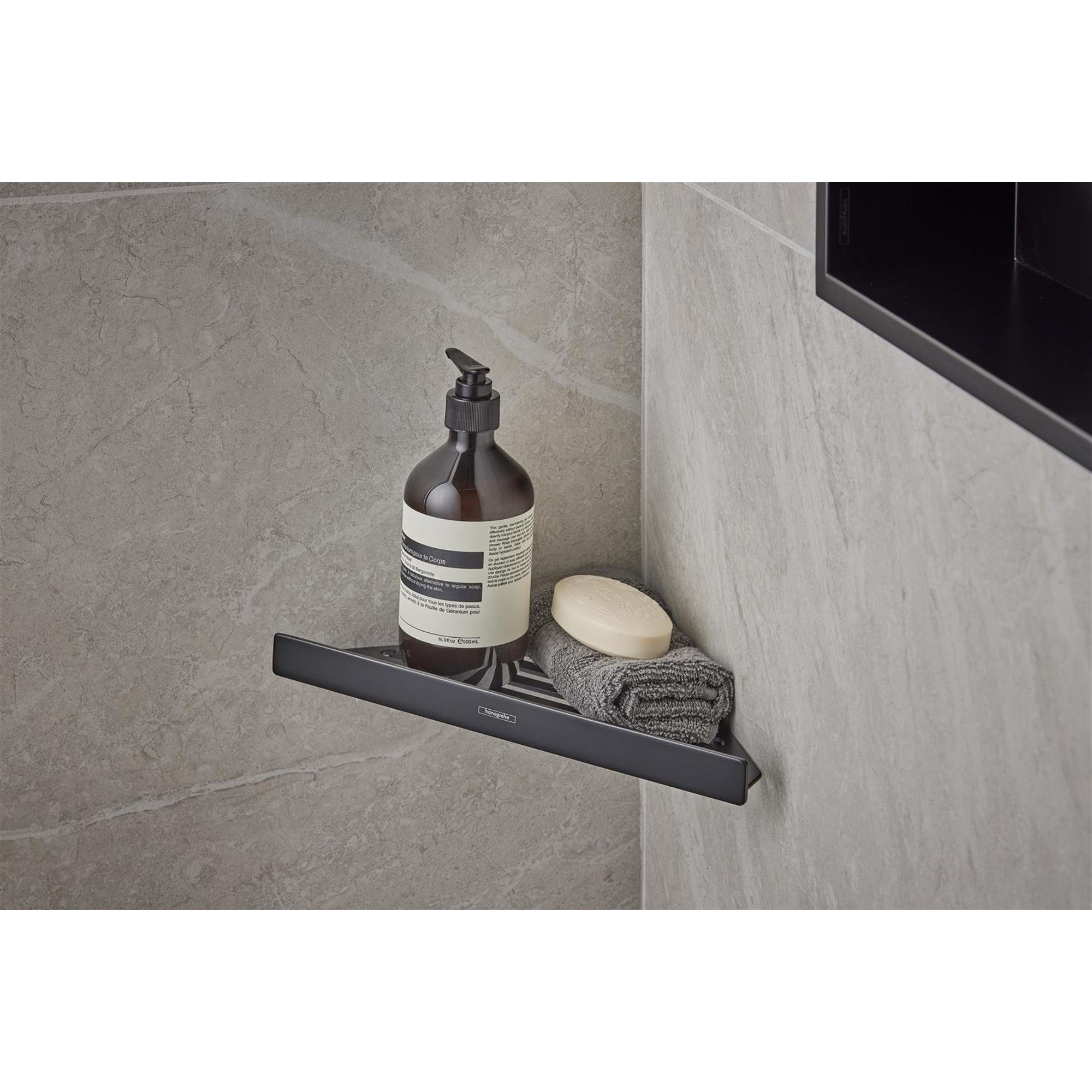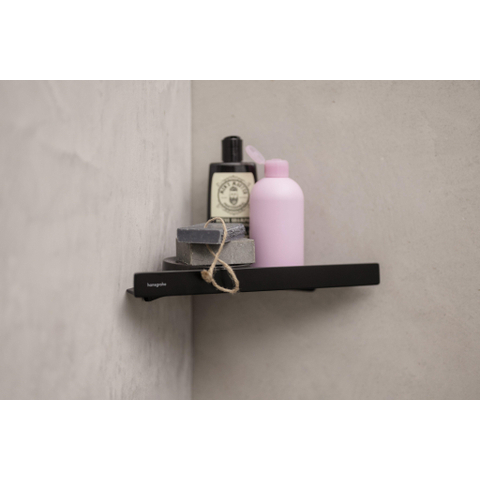 Het matte zwarte oppervlak geeft het planchet een tijdloze en moderne uitstraling die moeiteloos aansluit bij diverse badkamerstijlen. Het strakke, hoekige design zorgt voor een subtiele maar opvallende toevoeging aan je douchehoek. Door de combinatie met andere zwarte of geometrische elementen, zoals kranen uit de Metropol-serie, ontstaat een samenhangend en luxe geheel. Dit planchet is niet zomaar een accessoire, maar een stijlstatement dat jouw badkamer een extra dimensie geeft.