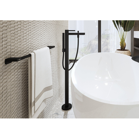 Het design van dit handdoekrek is modern en minimalistisch, met een matte zwarte finish die een luxe en tijdloze uitstraling geeft. Deze kleur past perfect bij strakke, geometrische vormen en sluit naadloos aan bij andere badkameraccessoires in dezelfde stijl. Het rek voegt een subtiele, maar krachtige visuele meerwaarde toe aan je badkamer, waardoor het geheel een harmonieuze en verzorgde indruk maakt. Door de verborgen bevestiging oogt het geheel bovendien strak en overzichtelijk, zonder storende schroeven of bevestigingsmaterialen in het zicht.