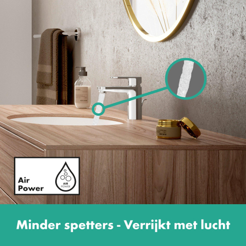 Gebruiksgemak staat centraal bij dit ontwerp. De ergonomisch gevormde greep maakt het instellen van waterhoeveelheid en temperatuur moeiteloos en nauwkeurig. De meegeleverde pop-up afvoergarnituur is eenvoudig te bedienen met één hand, wat het dagelijks gebruik extra comfortabel maakt. Dankzij de ComfortZone van 100 mm heb je voldoende ruimte onder de uitloop, ideaal voor allerlei handelingen bij de wastafel. Bovendien zorgt de AirPower-technologie ervoor dat het water rijk wordt verrijkt met lucht, wat resulteert in een volle, zachte waterstraal die minder spat. Zo geniet je van een prettige en hygiënische ervaring.