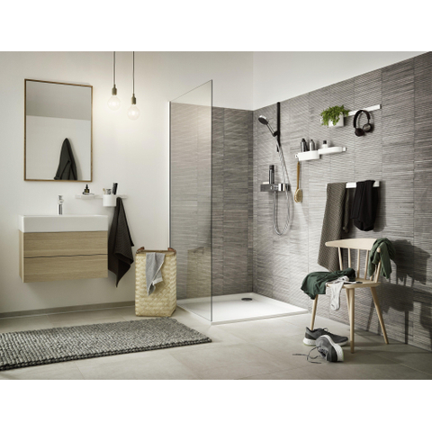 Dankzij het innovatieve EasyClick-systeem bevestig je eenvoudig verschillende accessoires zoals planchets en haken aan de wandrail. Dit maakt het mogelijk om je shampoo, douchegel en andere badkamerbenodigdheden overzichtelijk en binnen handbereik te organiseren. De montage is snel en zonder gereedschap te doen, wat het gebruiksgemak aanzienlijk verhoogt. Daarnaast biedt het wandelement je de vrijheid om je badkamerindeling aan te passen wanneer je wilt, zonder gedoe. Zo houd je je badkamer altijd netjes en praktisch ingericht.