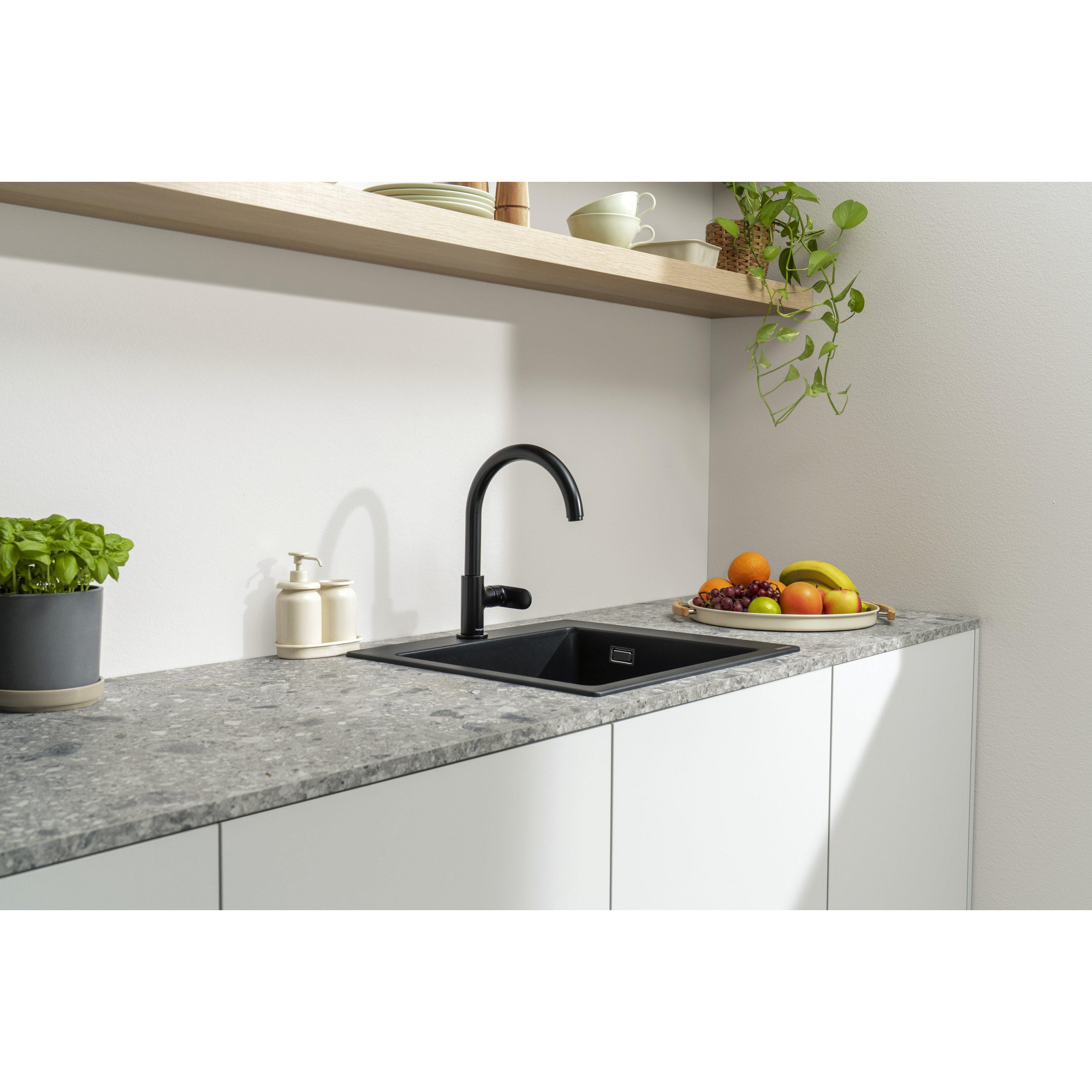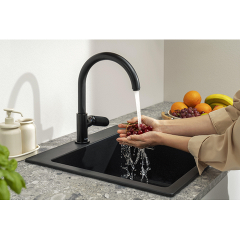De matzwarte finish van deze kraan is een echte blikvanger. Het tijdloze design voegt een moderne touch toe aan je keuken zonder te overheersen. Bovendien is de coating eenvoudig schoon te houden en behoudt deze zijn diepe, matte uitstraling jarenlang. Dit maakt de kraan niet alleen een esthetische keuze, maar ook een praktische, want vlekken en waterdruppels zijn minder zichtbaar. Zo blijft jouw keuken er altijd verzorgd uitzien, terwijl je geniet van een eigentijdse sfeer.