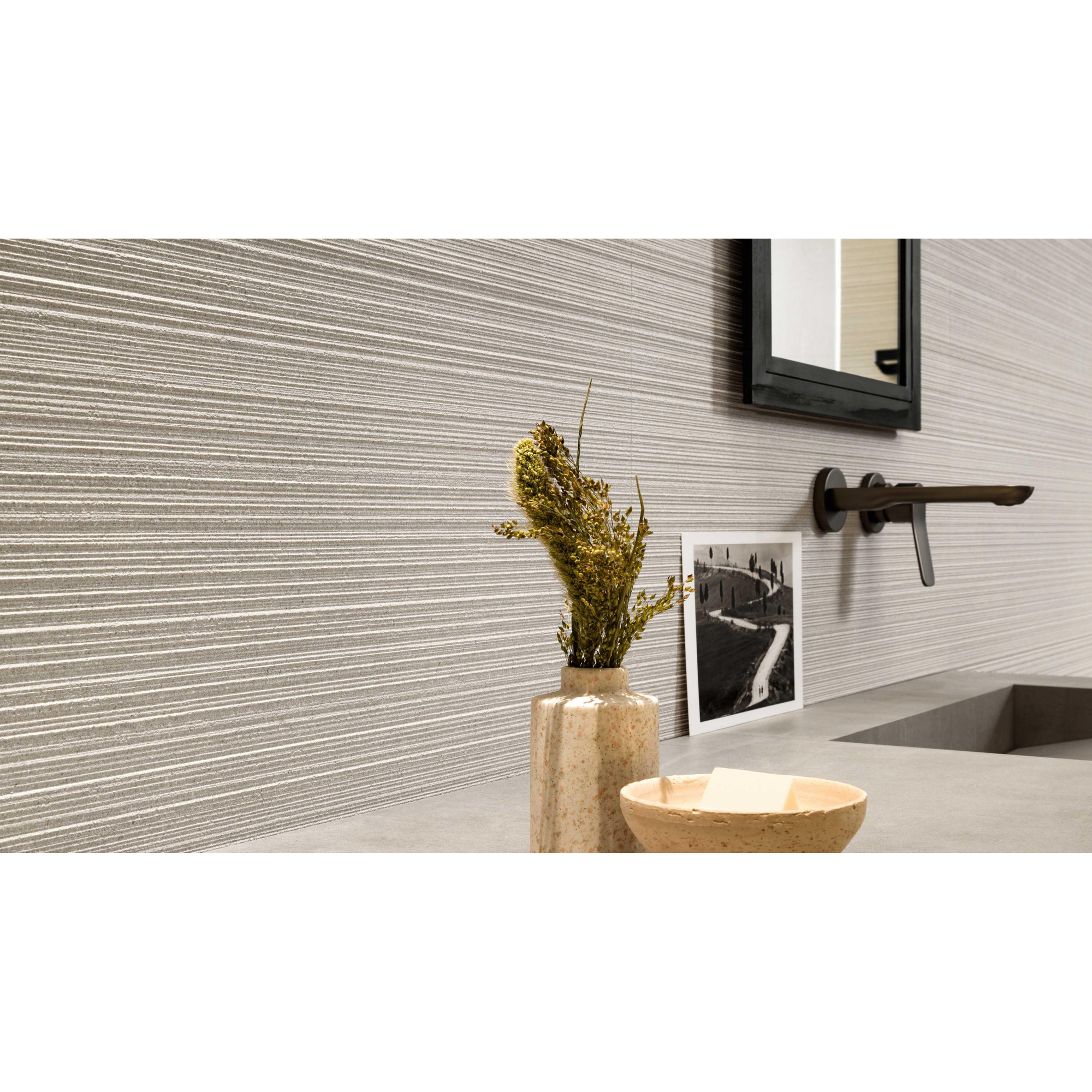 Deze wandtegel straalt een eigentijdse flair uit die perfect past bij een modern interieur. Met zijn strakke lijnen en minimalistische ontwerp brengt hij een gevoel van frisheid en vernieuwing in elke ruimte. De grijze tinten en het gerectificeerde formaat zorgen voor een moderne uitstraling die moeiteloos aansluit bij de laatste interieurtrends.