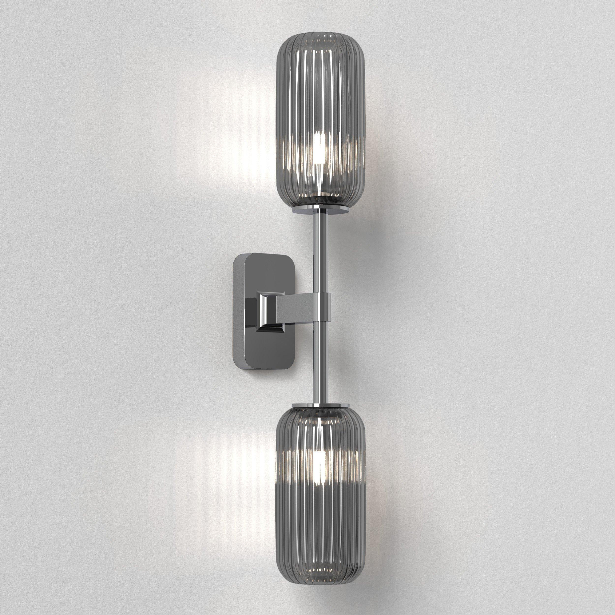 De combinatie van het glanzende chroom en de zachte, cilindrische glazen kappen zorgt voor een luxe hoteluitstraling in je eigen badkamer. De twee lichtpunten boven elkaar creëren een verfijnd, bijna klassiek silhouet, maar dan in een strak en modern jasje. Zo past dit armatuur moeiteloos in zowel een moderne, industriële als meer klassieke badkamer. Monteer er twee naast je spiegel voor een symmetrische look die rust en balans uitstraalt. Doordat de basis slank is, blijft het geheel luchtig en elegant, ook in een kleinere ruimte. Het resultaat: een tijdloze blikvanger die je badkamer optisch naar een hoger niveau tilt.