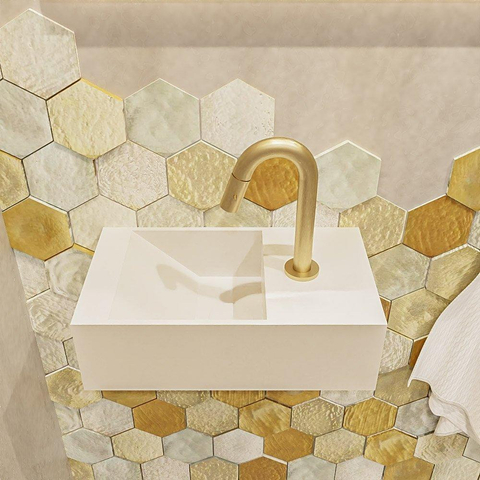 De speciale vorm van de fontein Tyne zorgen ervoor dat ook in de kleinere toiletruimte je kunt genieten van de chique uitstraling. De fontein in deze afbeeldingen is de TYNE 40cm kleur Talc