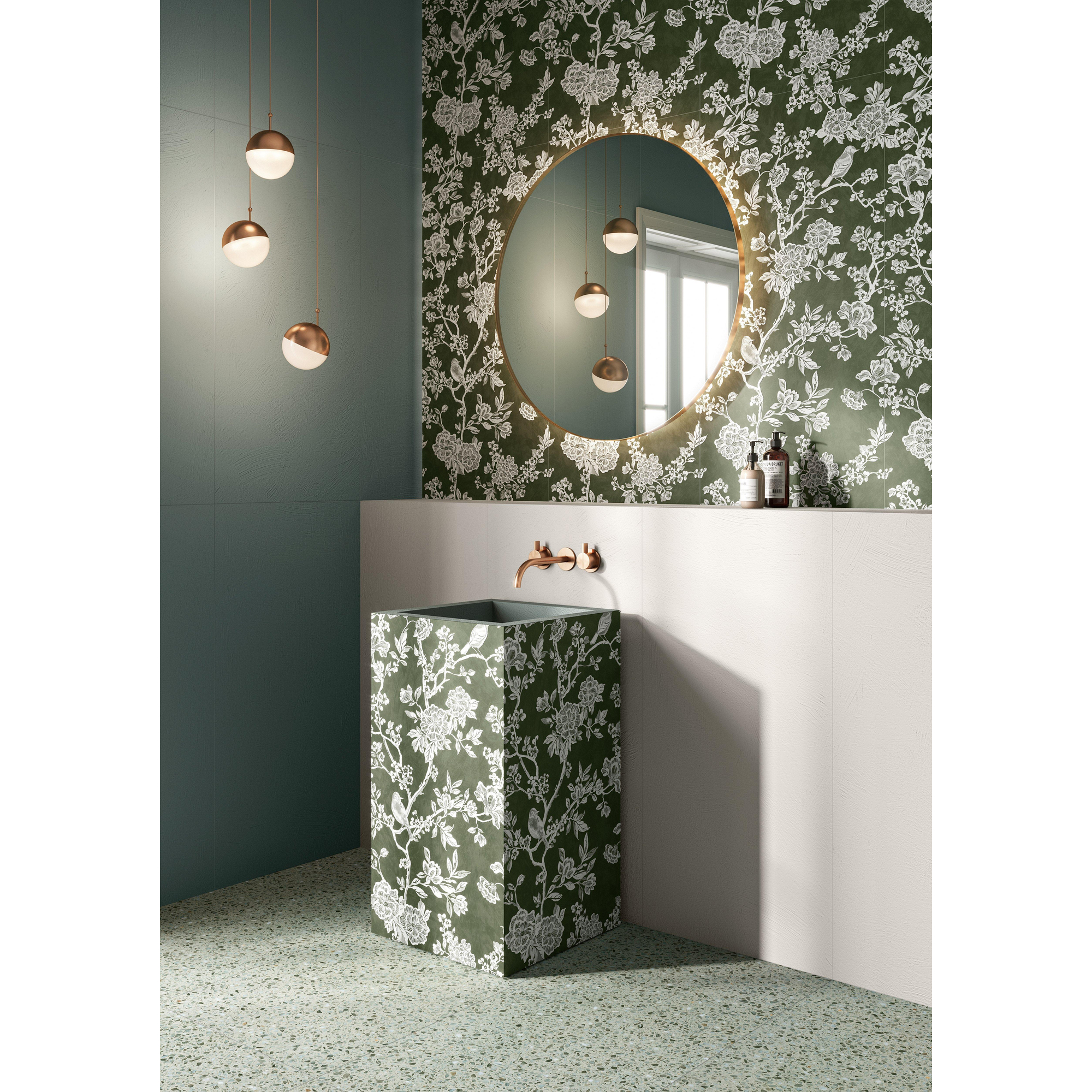 Ben je op zoek naar een opvallende, maar toch uitgebalanceerde blikvanger voor je badkamer of toilet? Deze decoratieve porseleinen wandtegel in een matte olijfgroene floral print is een stijlvolle keuze voor wie net even iets anders wil dan standaard tegels. Door het royale formaat van 60x120 cm en de gerectificeerde randen creëer je een rustig, bijna naadloos geheel, terwijl het behangachtige dessin juist warmte en persoonlijkheid toevoegt. Ideaal als accentwand in de douche, achter het bad of als sfeervolle achterwand bij een wastafelmeubel, in zowel moderne als eclectische interieurs. Dankzij het duurzame porcellanato-materiaal en de vlakke, geglazuurde oppervlakte is deze decorstrip bovendien prima te combineren met effen tegels uit dezelfde reeks voor een harmonieus totaalbeeld.