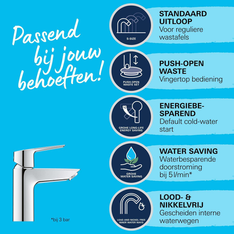 Met de GROHE Long-Life Finish geniet je van een kraan die bestand is tegen krassen en verkleuring. De binnenkant is voorzien van gescheiden waterwegen, waardoor het water lood- en nikkelvrij blijft – een belangrijke garantie voor gezond drinkwater. Daarnaast zorgt de keramische cartouche met GROHE SilkMove technologie voor een soepele bediening die jarenlang meegaat. Dankzij de waterbesparende functies zoals de doorstroombegrenzer van 5,7 liter per minuut bespaar je niet alleen water, maar ook op je energiekosten. Zo draag je bij aan een duurzame levensstijl zonder in te leveren op comfort.