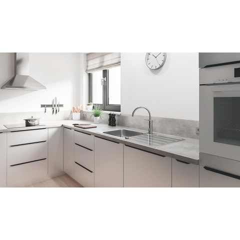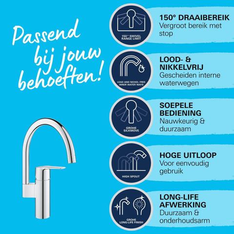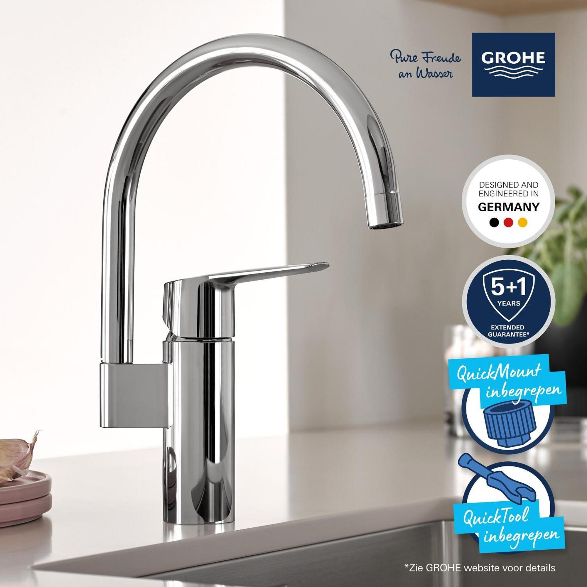 De kraan is ontworpen met het oog op gebruiksgemak. De hoge uitloop met een draaibereik van 150 graden geeft je maximale bewegingsvrijheid, wat het vullen van grote pannen of het schoonmaken van de spoelbak een stuk eenvoudiger maakt. De soepele bediening dankzij de GROHE SilkMove technologie zorgt voor een nauwkeurige en moeiteloze regeling van waterstroom en temperatuur. Daarnaast maakt het QuickMount-systeem de installatie snel en zonder gedoe, zodat je binnen no-time kunt genieten van je nieuwe aanwinst.