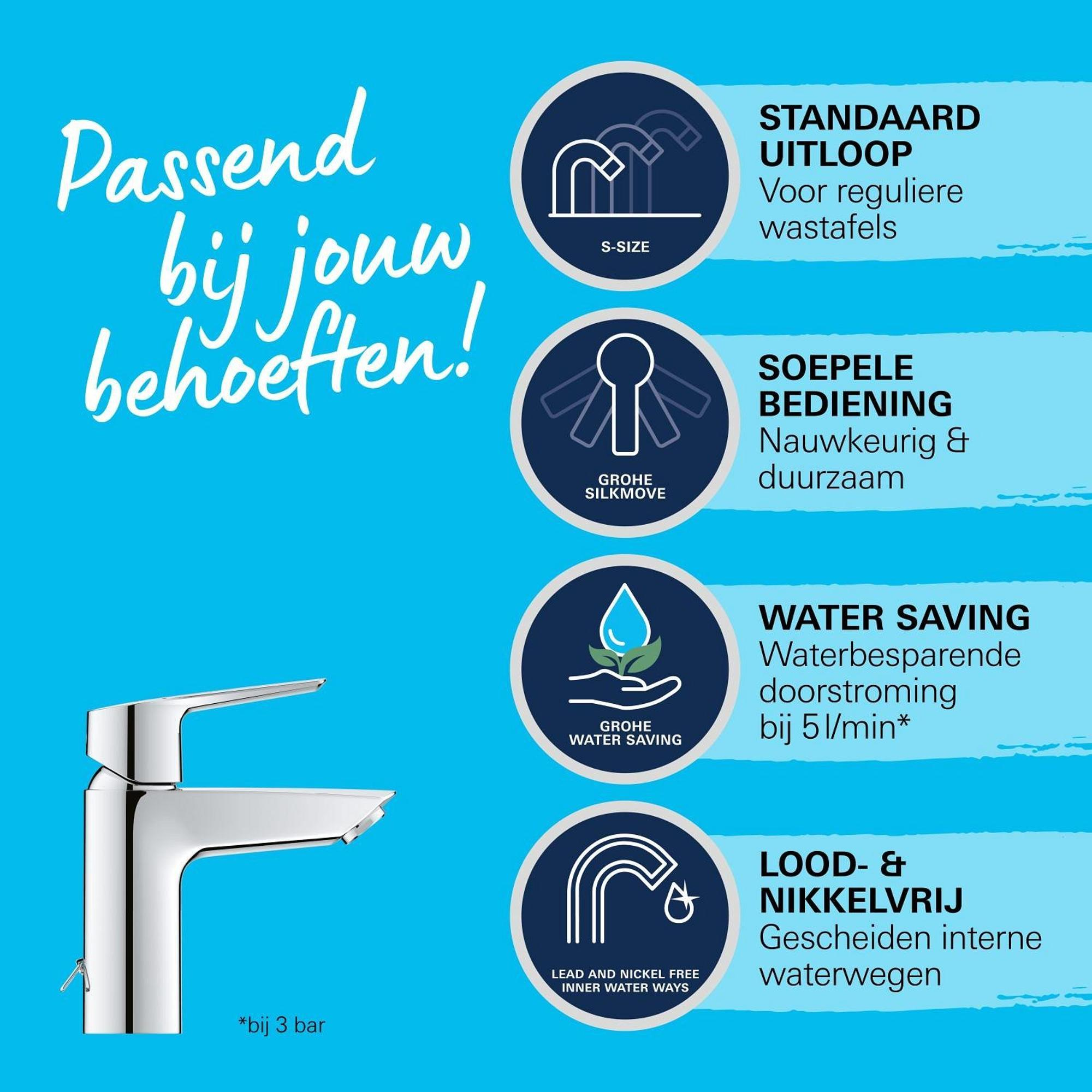 Met hoogwaardige materialen en de beproefde GROHE Long-Life Finish geniet je van een kraan die lang meegaat en er als nieuw blijft uitzien. De binnenwaterwegen zijn lood- en nikkelvrij, wat zorgt voor gezond en puur water. Daarnaast draagt de geïntegreerde temperatuurbegrenzer bij aan energiebesparing, terwijl de WaterSaving technologie de waterstroom beperkt tot 5,7 liter per minuut zonder in te leveren op comfort. Zo kies je bewust voor een milieuvriendelijke oplossing die ook jouw portemonnee ontziet.Functioneel