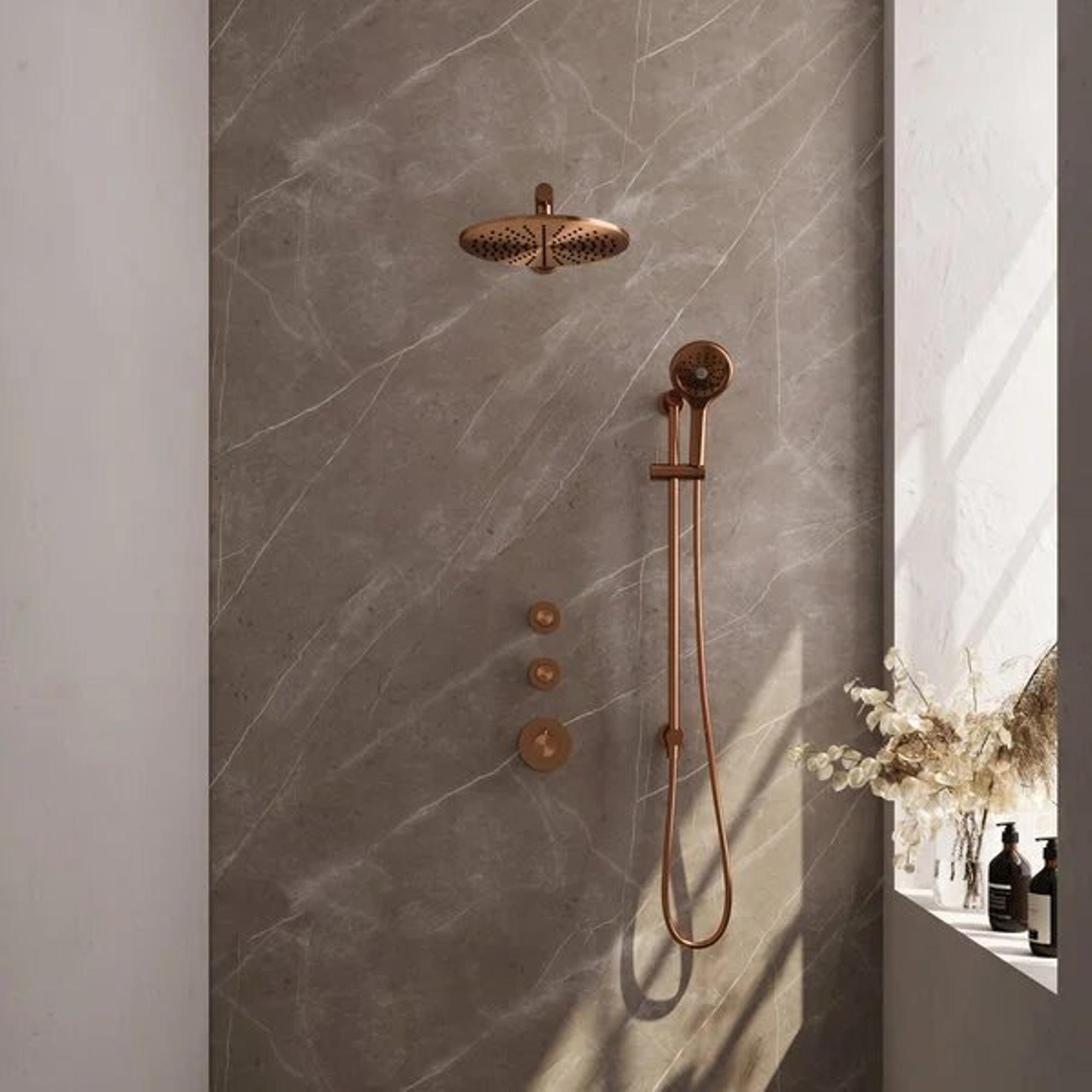 Diameter hoofddouche: 30 cm -40cm Wandarm gebogen - 3 stand(en) Rond handdouche - Koper geborsteld - Carving knop (€ 1.322,69 )