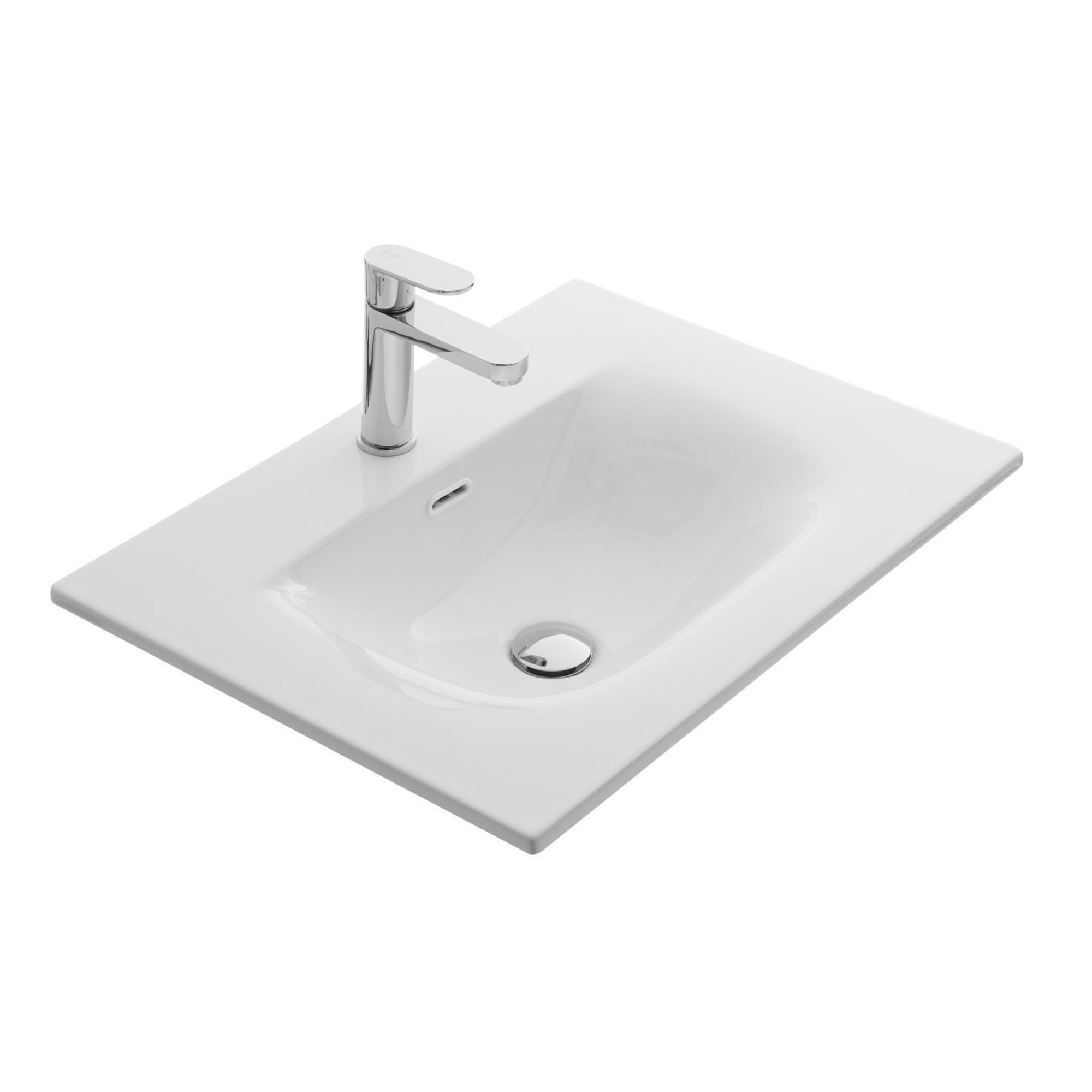 Met een breedte van 60 cm biedt deze wastafel verrassend veel comfort in een compacte vorm. De enkele kom is ruim genoeg voor dagelijkse routines, van snel je handen wassen tot uitgebreid je gezicht verzorgen, zonder dat het water alle kanten opspat. Het geïntegreerde kraangat maakt de keuze voor een bijpassende opbouwkraan eenvoudig en zorgt voor een overzichtelijk geheel op je wastafelblad. Doordat alles mooi gecentreerd is, houd je voldoende aflegruimte rondom de kom voor zeep, een beker of je favoriete verzorgingsproducten. Dit maakt het een praktische oplossing voor gezinsbadkamers, maar ook voor logeer- en hotelwaardige badkamers waar comfort en uitstraling hand in hand gaan.