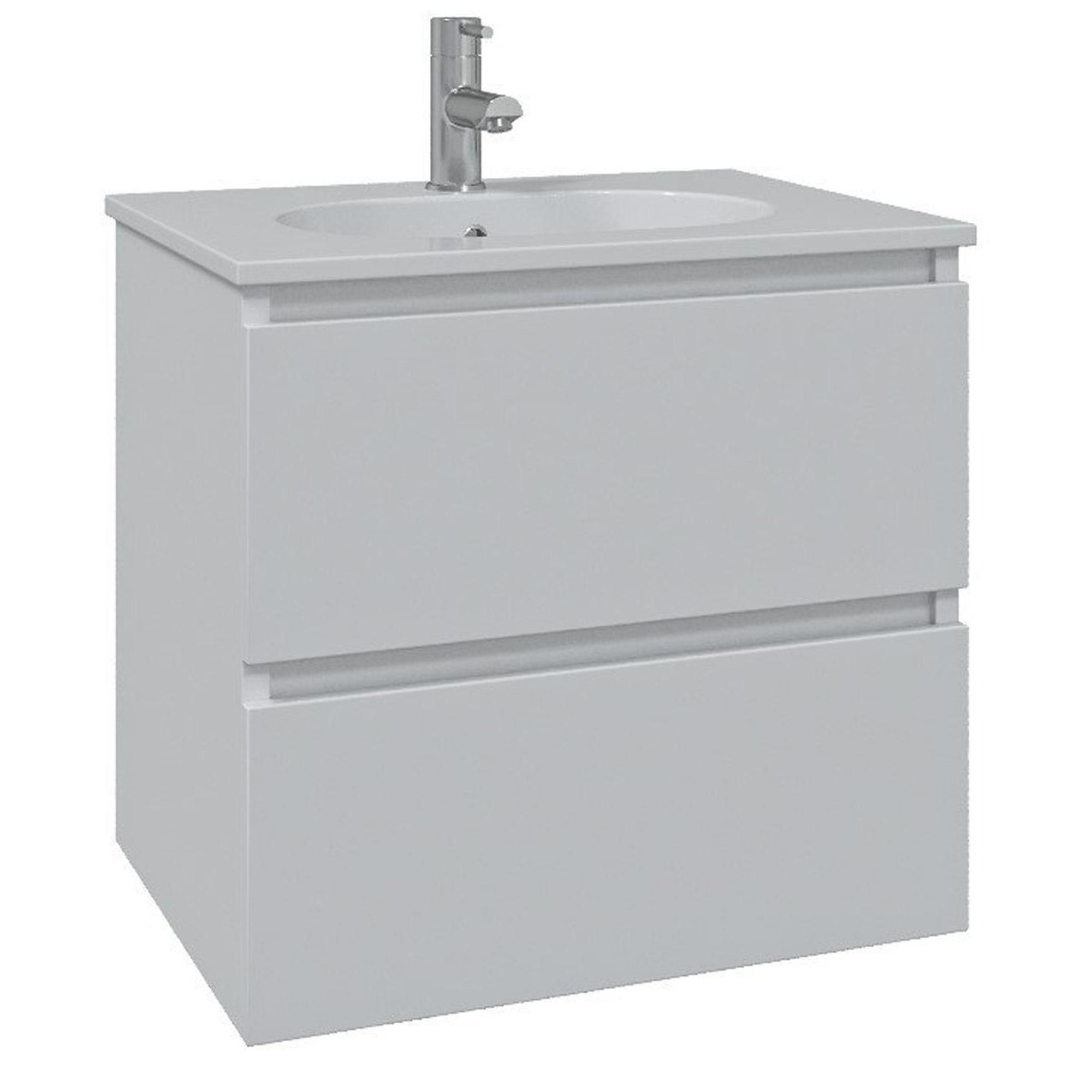 De Saniclass Chaci Badkamermeubelset is een prachtige toevoeging aan elke badkamer. Met zijn elegante ontwerp en hoogwaardige afwerking, zal dit meubelstuk zeker de aandacht trekken en een gevoel van luxe toevoegen aan de ruimte. Het meubelset is voorzien van een ovale keramische wasbak in een heldere witte kleur, samen met een kraangat en twee handige lades voor opbergruimte. De mat witte afwerking geeft het geheel een moderne uitstraling die perfect past bij verschillende badkamerstijlen. Met afmetingen van 80x46x57cm is dit meubelset zowel praktisch als stijlvol.