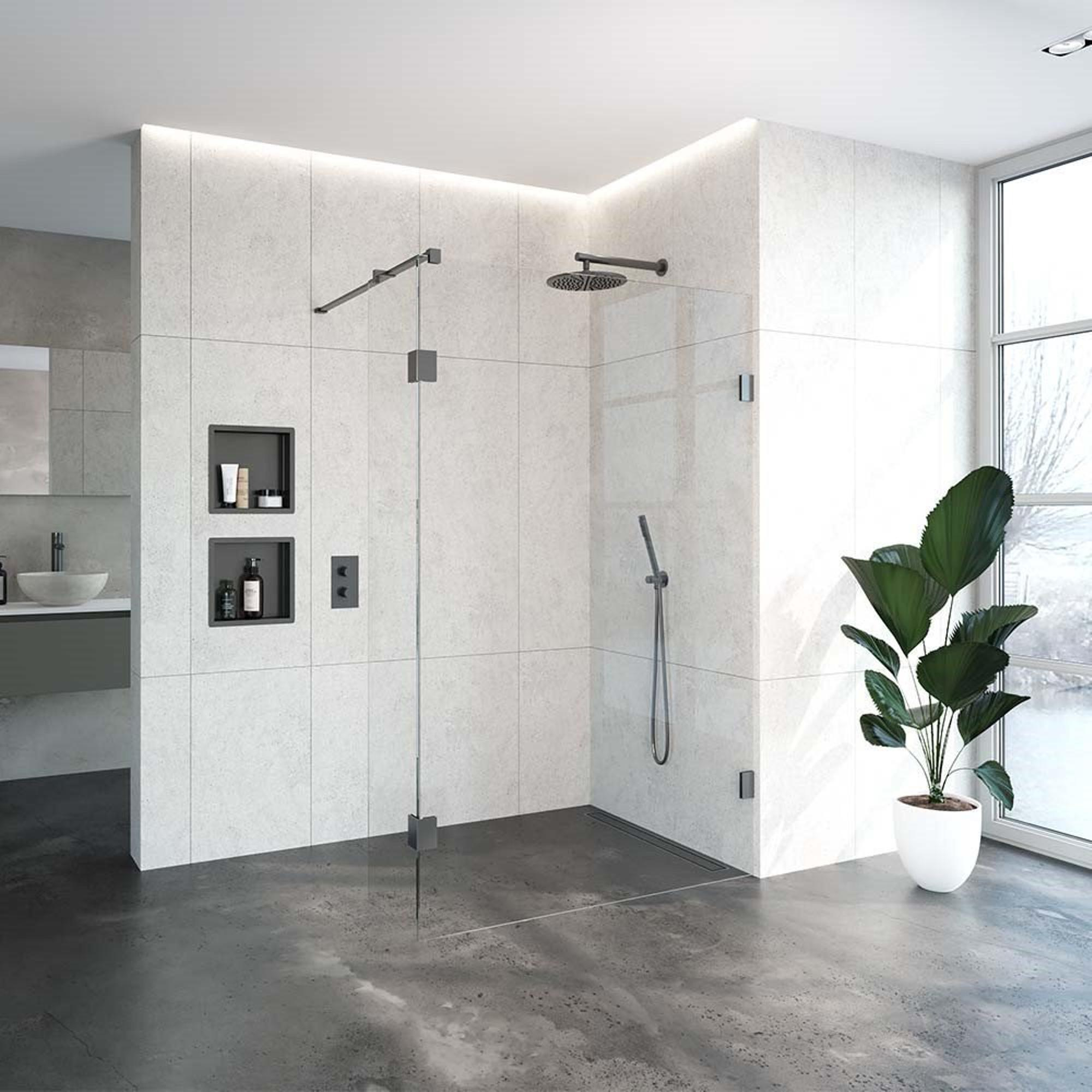 De Saniclass Create Complete Profielloze Inloopdouche straalt stijl en klasse uit dankzij zijn gunmetal geborstelde afwerking. Deze unieke kleur geeft de inloopdouche een eigentijdse uitstraling die perfect past bij moderne badkamerinterieurs. De combinatie van het profielloze ontwerp en de gunmetal afwerking creëert een harmonieus geheel dat je badkamer een luxueuze uitstraling geeft.