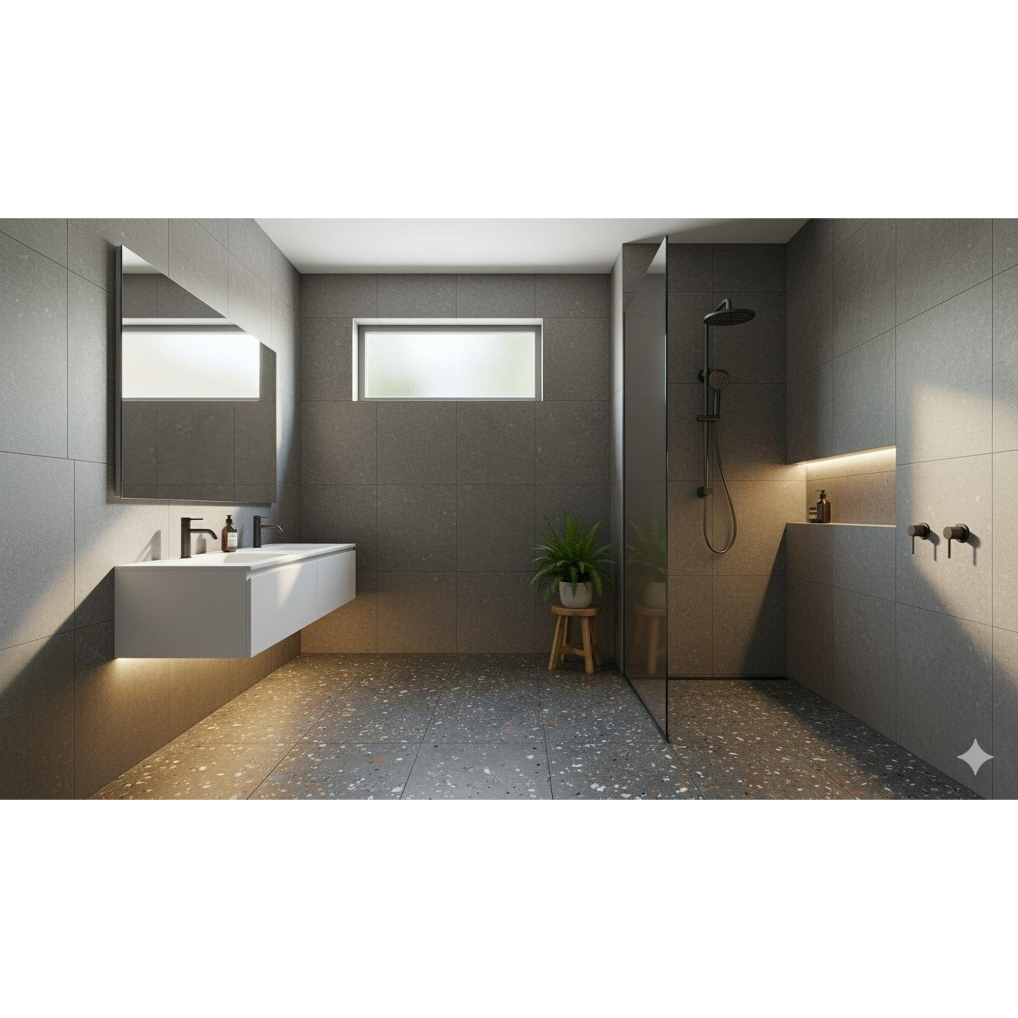 De Prissmacer Cerámica Gobi wand- en vloertegel in 60x60cm formaat straalt een tijdloze elegantie uit die elke badkamer of keuken transformeert tot een stijlvolle ruimte. Met zijn verfijnde Terrazzo design in Antraciet mat, voegt deze tegel een vleugje luxe toe aan elke omgeving. De gerectificeerde afwerking zorgt voor strakke lijnen en een naadloze uitstraling, terwijl de vierkante vorm een moderne touch geeft aan het geheel. Met een dikte van 10mm is deze tegel duurzaam en geschikt voor zowel wand- als vloertoepassingen, waardoor hij zowel praktisch als esthetisch aantrekkelijk is.