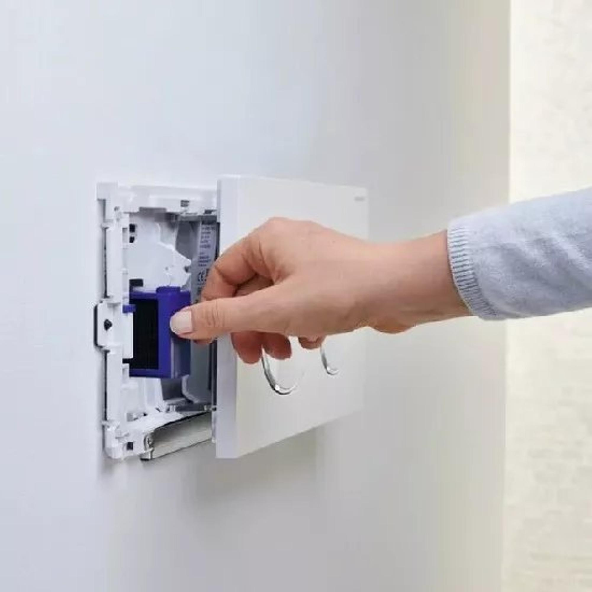 Voor extra frisheid en hygiëne kunt u de Geberit DuoFresh toiletstick in de houder achter de bedieningsplaat plaatsen zodat hij in het reservoir valt. Dit zorgt voor een frisse spoeling van het toilet. Standaard wordt bij een Geberit DuoFresh systeem al 8 toiletsticks meegeleverd. Zo kunt u direct genieten van een fris toilet.