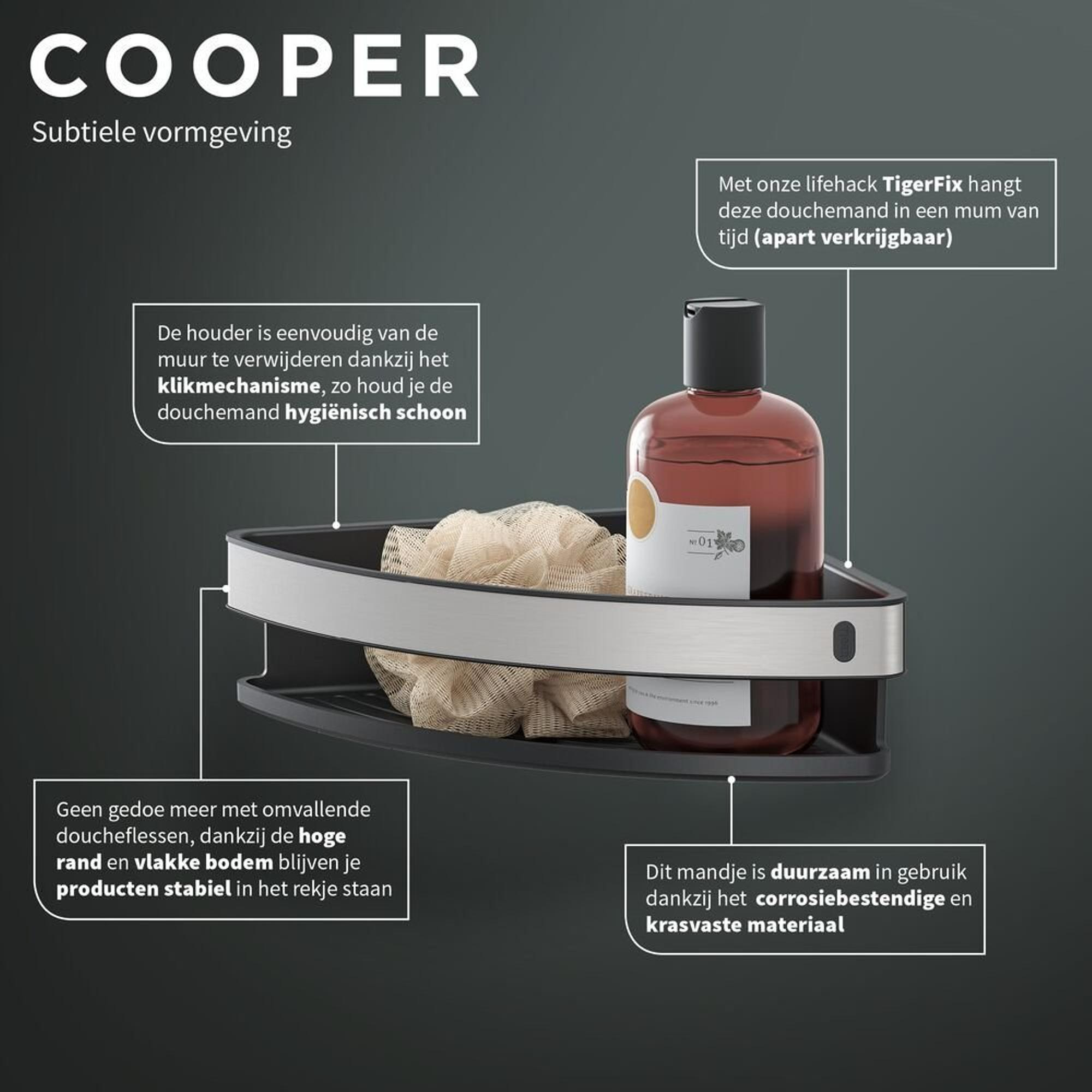 Ronde vormen, cilindervormen, ovalen, ellipsen, cirkels en eivormen. Met Cooper gaan we verder dan rond. De zachte vormgeving brengt je in balans. Zeg nu zelf, met een harmonieus interieur haal je meer positieve energie in huis. Deze hoekmand van Tiger Cooper straalt rust en evenwichtigheid uit, maar dankzij het subtiele kleuraccent is hij ook een beetje spannend. Cooper is eenvoudig te bevestigen met TigerFix, onze lifehack voor iedereen die niet wil boren. Met TigerFix bevestig je onze accessoires snel en eenvoudig op een gladde, stevige ondergrond. TigerFix is apart verkrijgbaar.