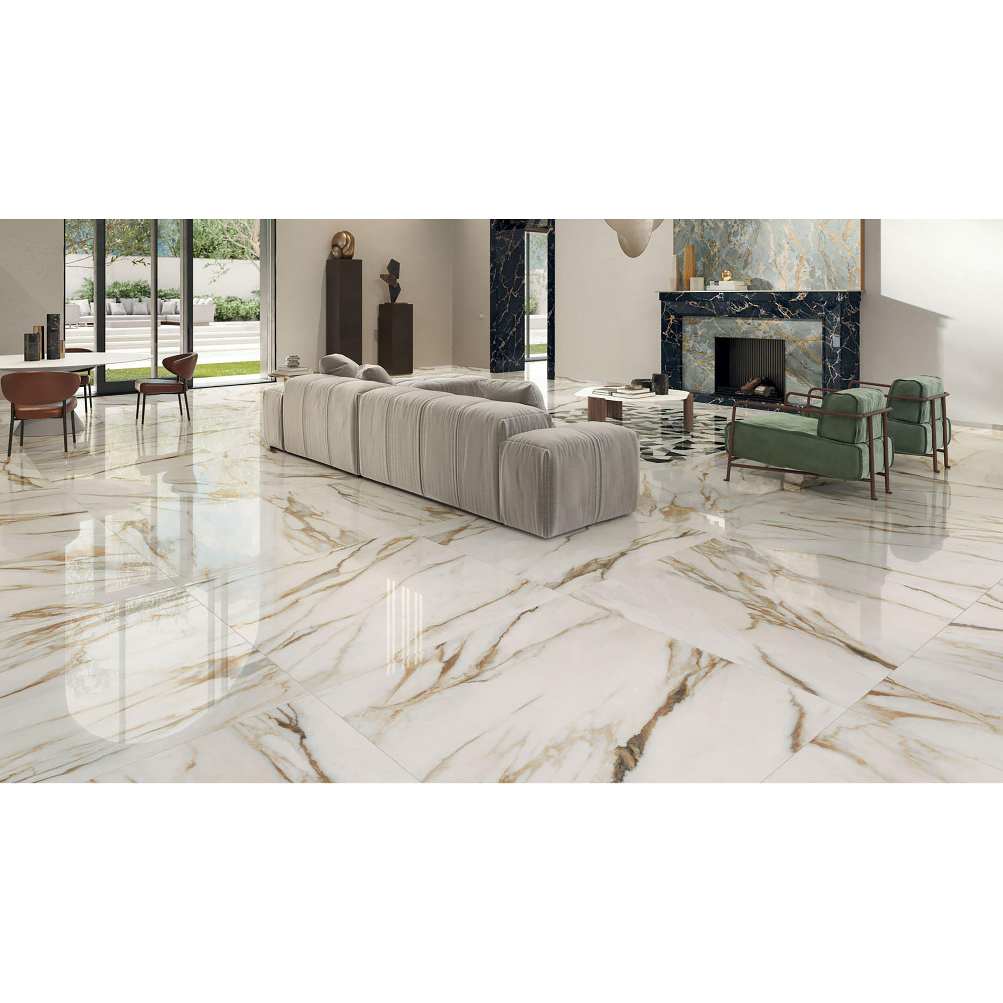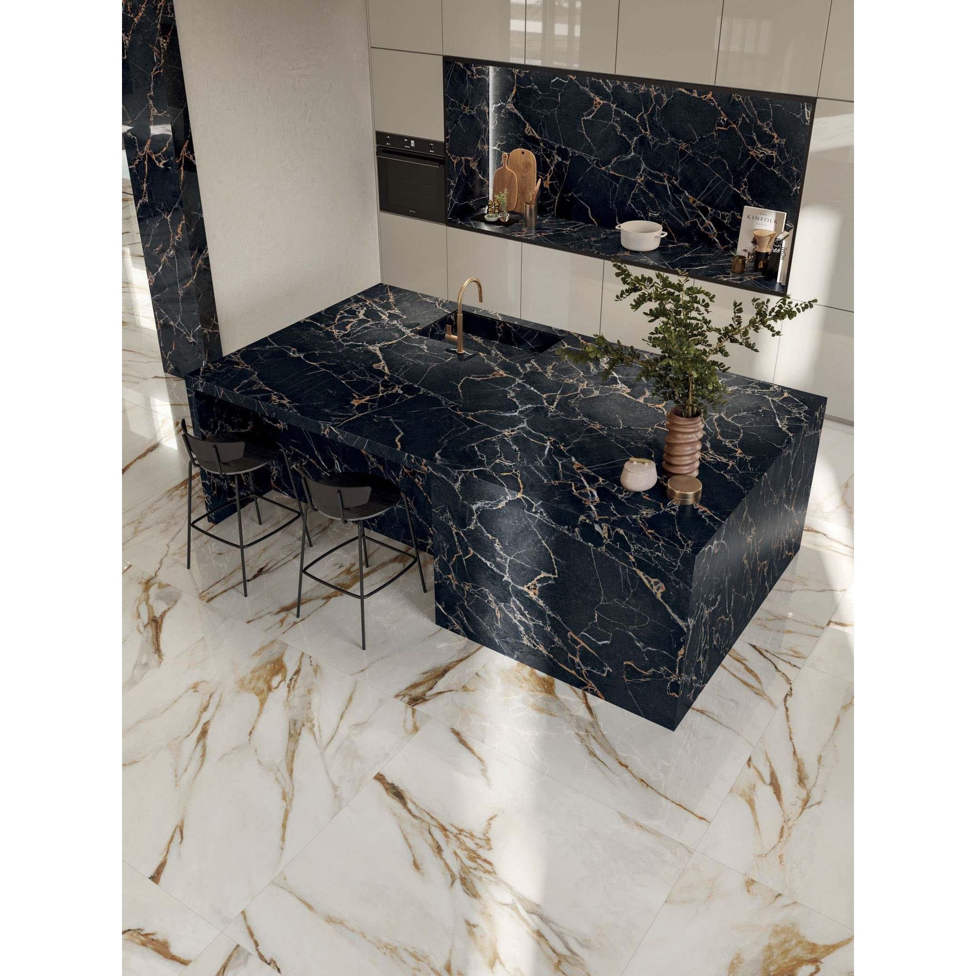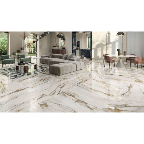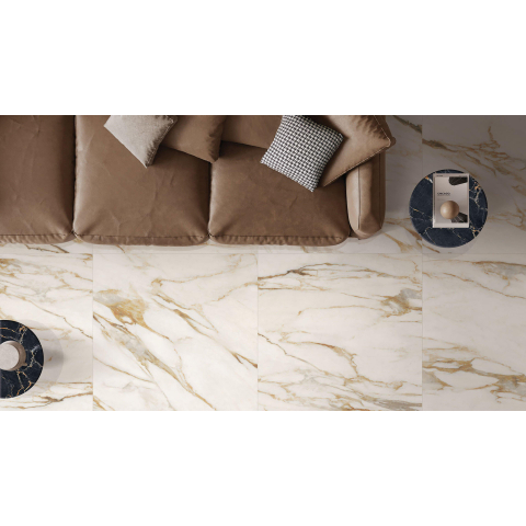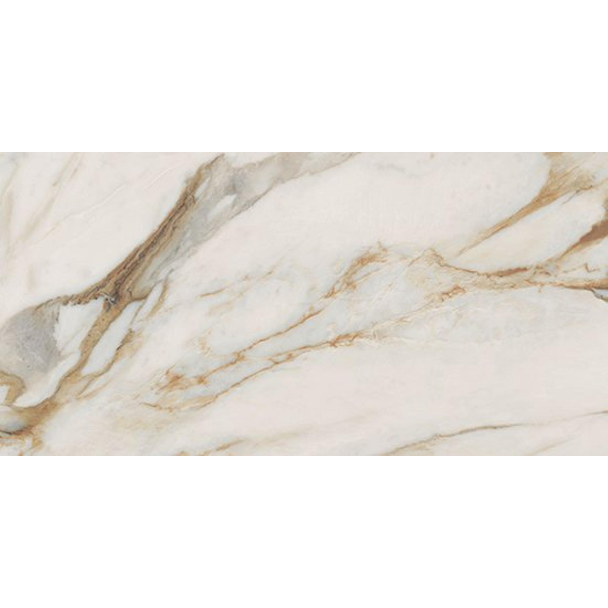 Deze tegel straalt een majestueuze uitstraling uit door zijn glanzende afwerking en gedetailleerde marmerpatroon. Het gouden en witte kleurenpalet zorgt voor een luxueuze en koninklijke ambiance in elke ruimte waarin het wordt geplaatst. De grootte van 60x119cm geeft een ruimtelijk gevoel en laat de tegel opvallen als een echt pronkstuk in de badkamer.