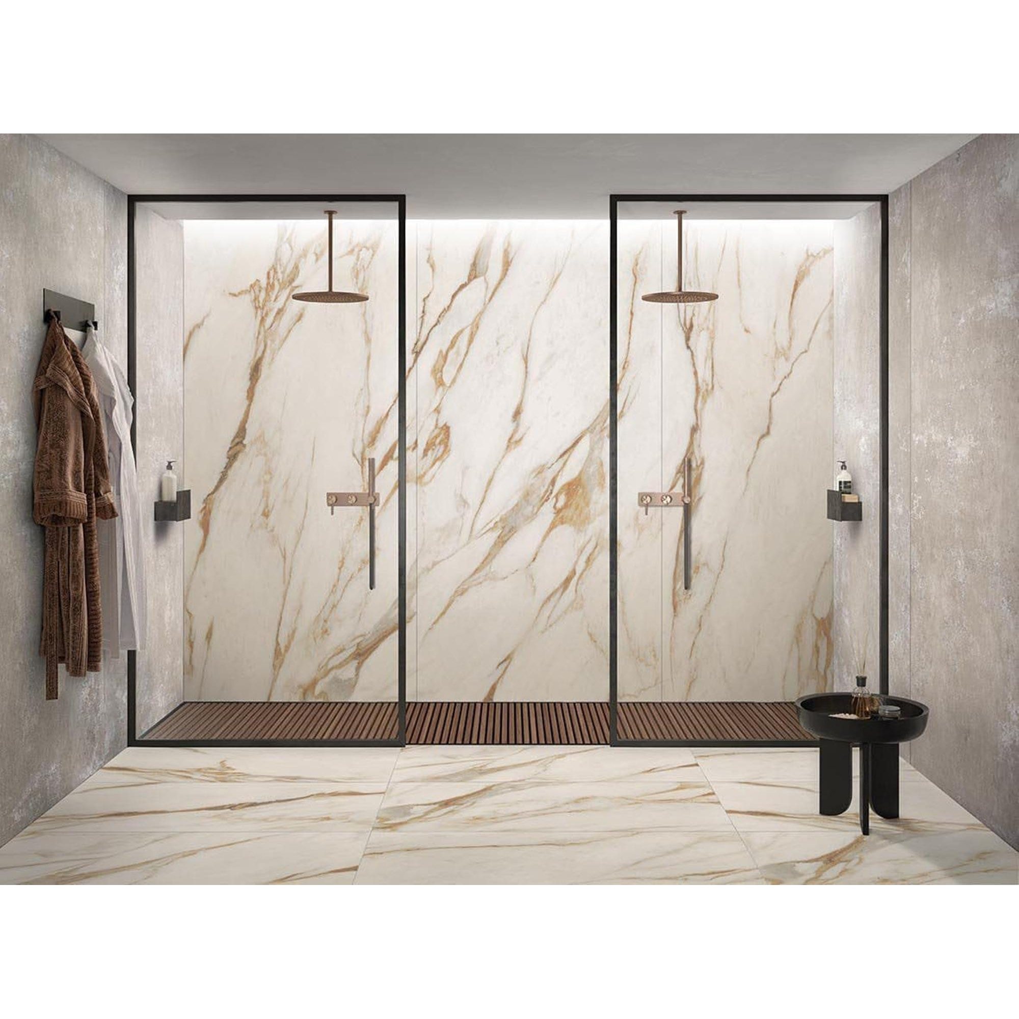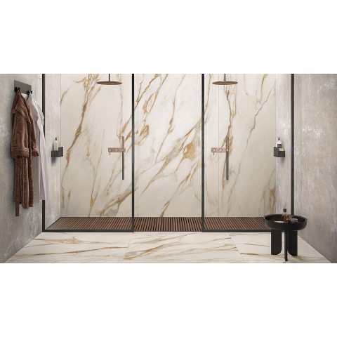 Met zijn gerectificeerde randen en porcellanato materiaal straalt deze tegel pure elegantie uit. De Calacatta Venna Oro afwerking voegt een vleugje klasse toe aan elke ruimte en creëert een tijdloze en stijlvolle uitstraling. De combinatie van gouden en marmeren details zorgt voor een verfijnde en chique look die elke badkamer transformeert tot een luxe oase.