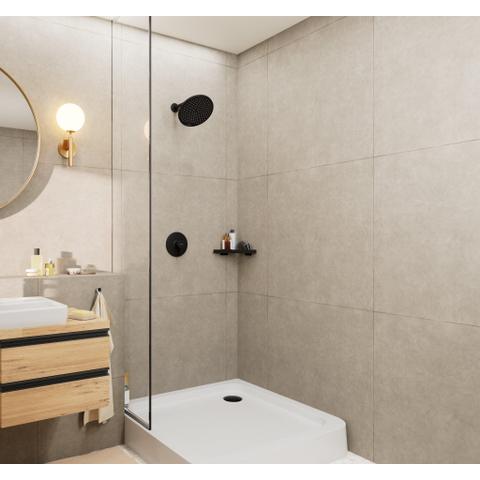 Het matzwarte oppervlak geeft deze hoofddouche een tijdloze en eigentijdse look die direct opvalt. Deze kleur past perfect in moderne badkamers en zorgt voor een verfijnde, luxe sfeer. Door het minimalistische design en de strakke lijnen krijgt jouw badkamer een professionele uitstraling zonder te overheersen. Bovendien is de afdekplaat van kunststof subtiel en duurzaam, waardoor het geheel er altijd verzorgd uitziet. Zo voeg je een stijlvol element toe dat jarenlang mooi blijft.