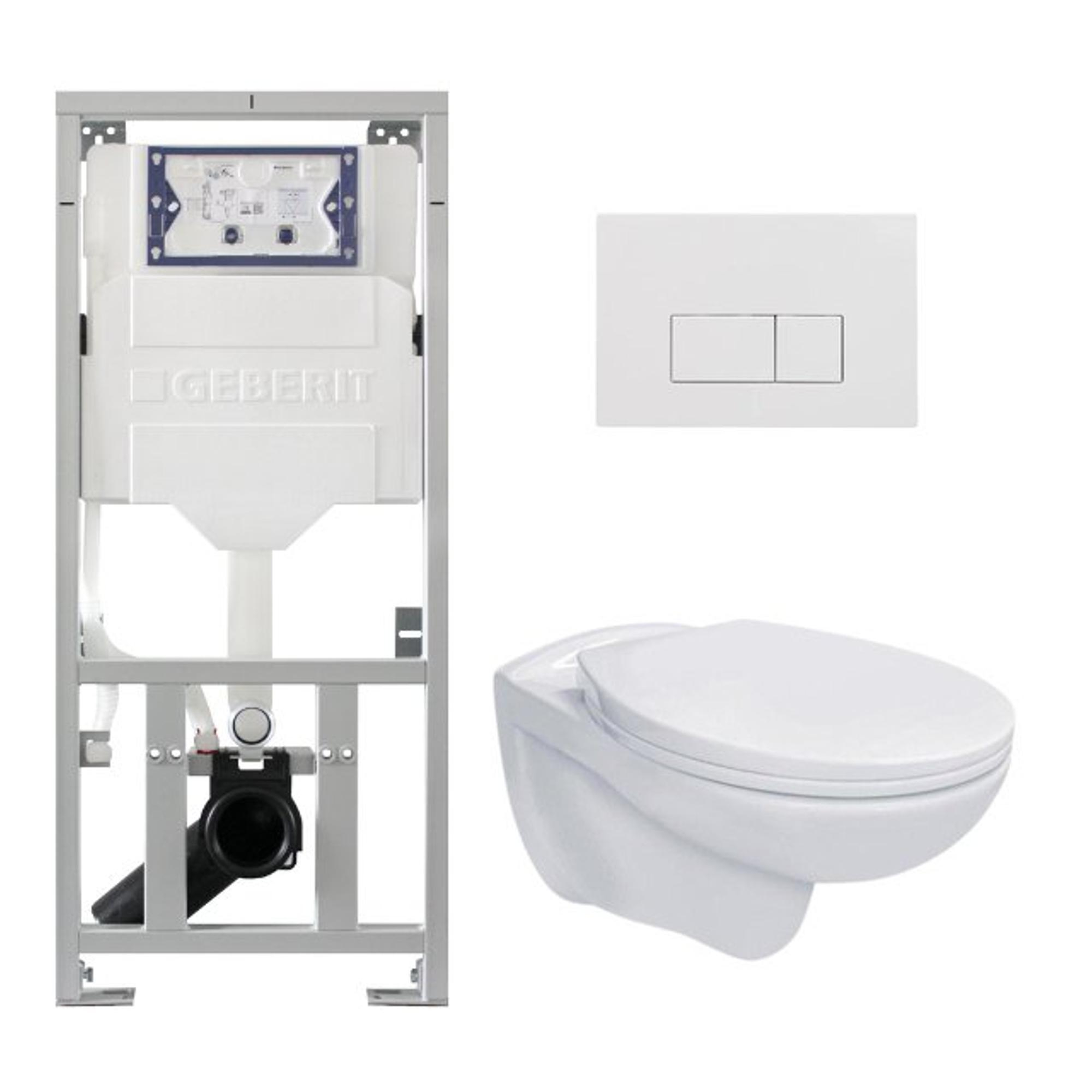 - Complete set met wandcloset, inbouwreservoir, basic zitting en witte bedieningsplaat met rechte knoppen