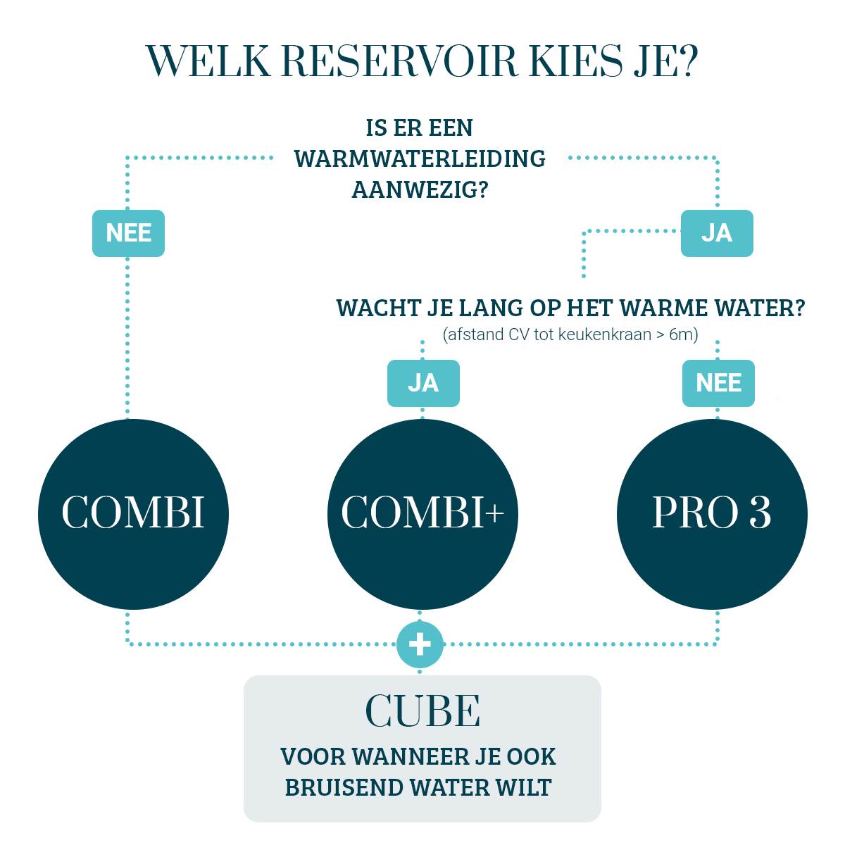 De COMBI+ is aangesloten op zowel de koud- als de warmwaterleiding. Net als de 'gewone' COMBI rekent hij af met het lange wachten op warm water en de verspilling van drinkwater. Door de aansluiting op de warmwaterleiding heb je onbeperkt warm water.