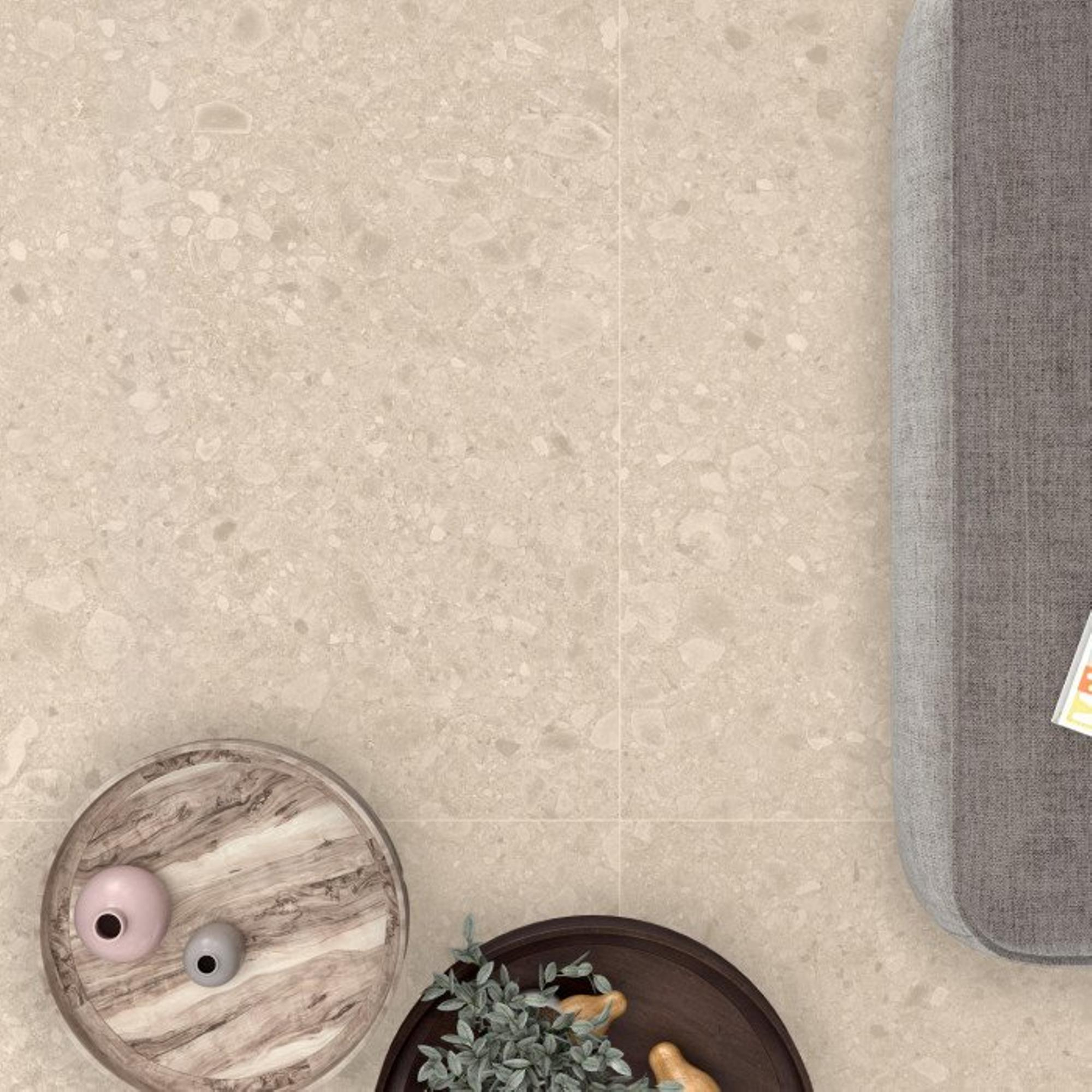Deze tegel is uiterst veelzijdig in gebruik. Dankzij zijn formaat van 60x60cm is hij geschikt voor zowel vloer- als wandtoepassingen. Of je nu een grote ruimte wilt bedekken of een accentmuur wilt creëren, deze tegel past zich moeiteloos aan elke situatie aan. Zijn neutrale kleur en tijdloze uitstraling maken hem geschikt voor zowel moderne als traditionele interieurs, waardoor je eindeloos kunt variëren en combineren.