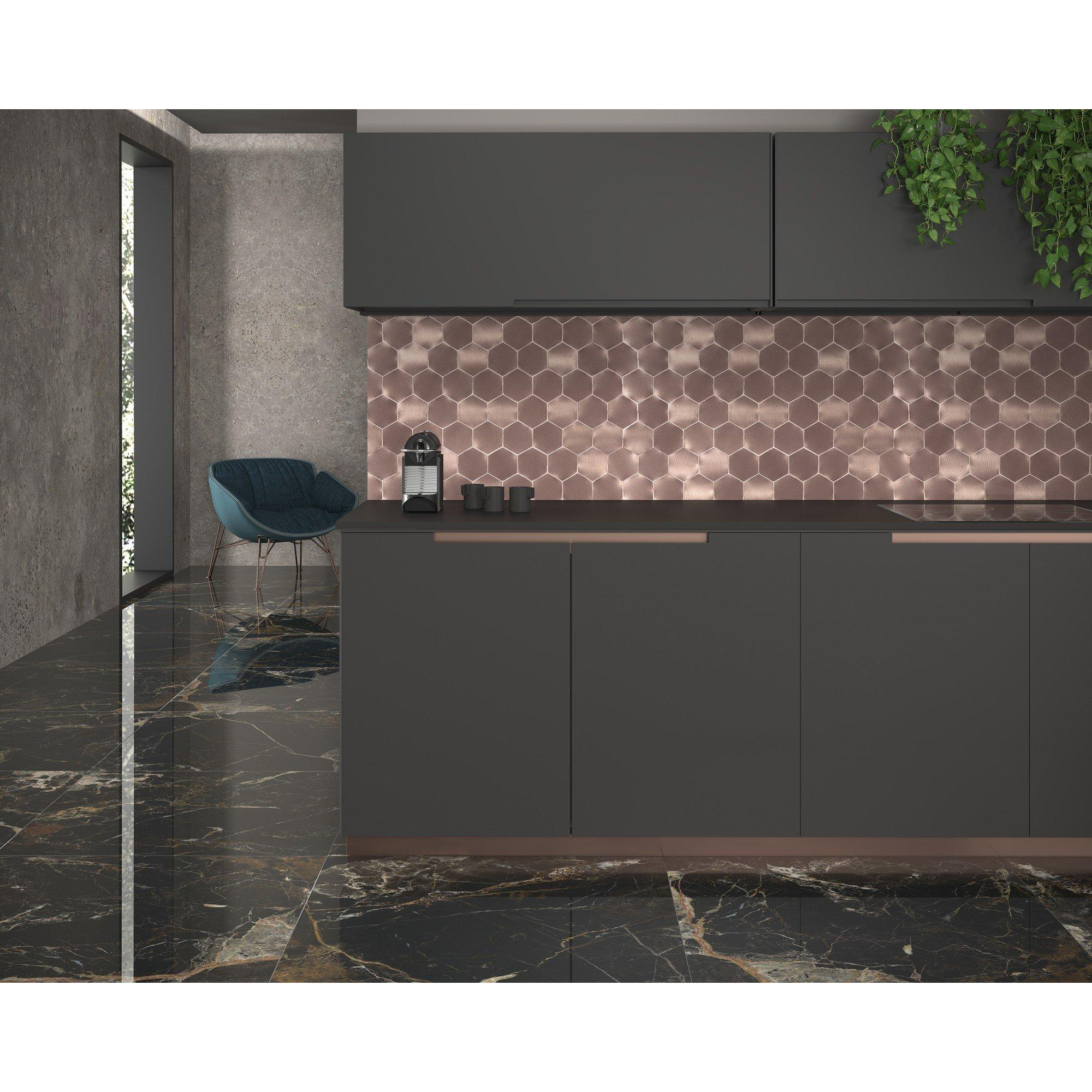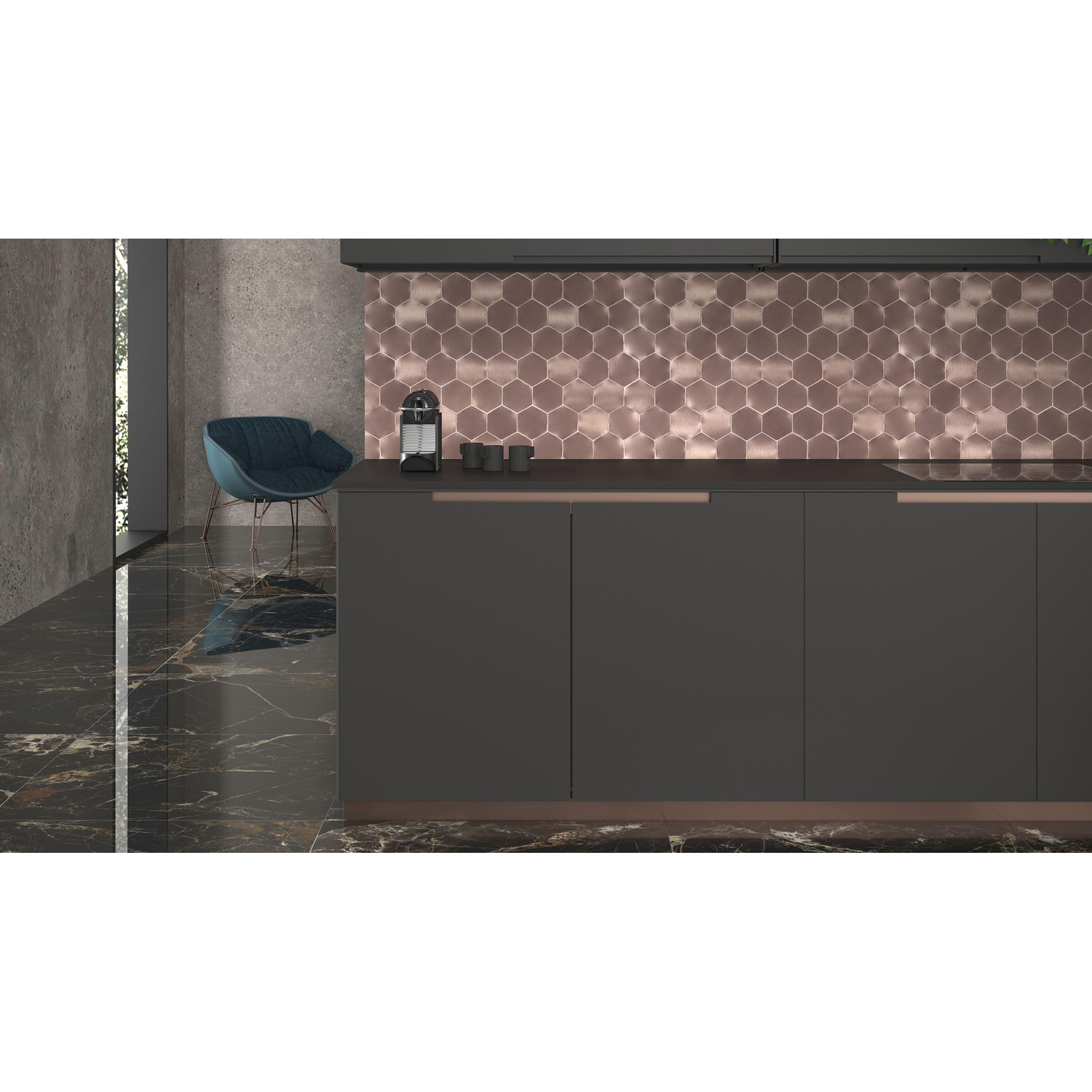 De Dune Materia Mosaics Mozaiektegel combineert moeiteloos modern design met tijdloze schoonheid. Het gebruik van hexagonale vormen en koperen tinten geeft deze tegel een eigentijdse uitstraling die perfect past bij een modern interieur. Of je nu een minimalistische of een meer gedurfde stijl hebt, deze tegel voegt een vleugje moderniteit toe aan elke badkamer.
