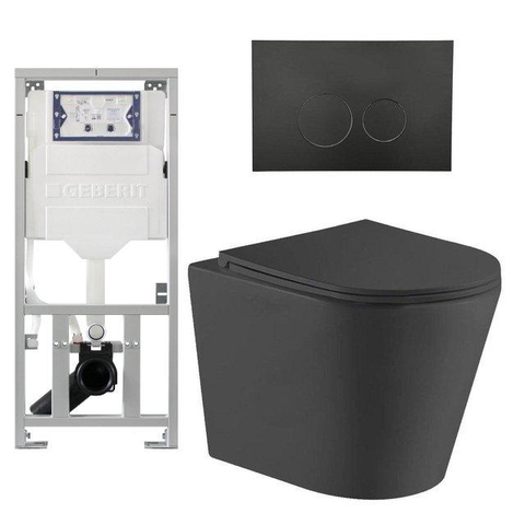 QeramiQ Dely Toiletset - 36.3x51.7cm - diepspoel - rimless - Geberit UP320 inbouwreservoir - softclose toiletzitting - mat zwarte bedieningsplaat - ronde knoppen - zwart mat