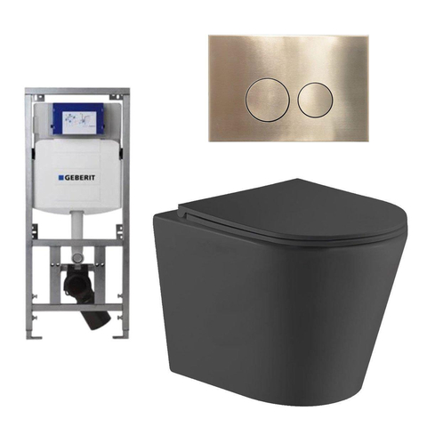 QeramiQ Dely Toiletset - 36.3x51.7cm - diepspoel - rimless - Geberit UP320 inbouwreservoir - softclose toiletzitting - geborsteld messing bedieningsplaat - ronde knoppen - zwart mat