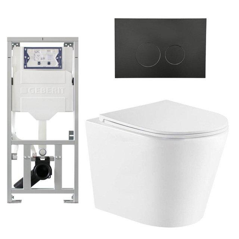 QeramiQ Dely Toiletset - 36.3x51.7cm - diepspoel - rimless - Geberit UP320 inbouwreservoir - softclose toiletzitting - mat zwarte bedieningsplaat - ronde knoppen - wit glans
