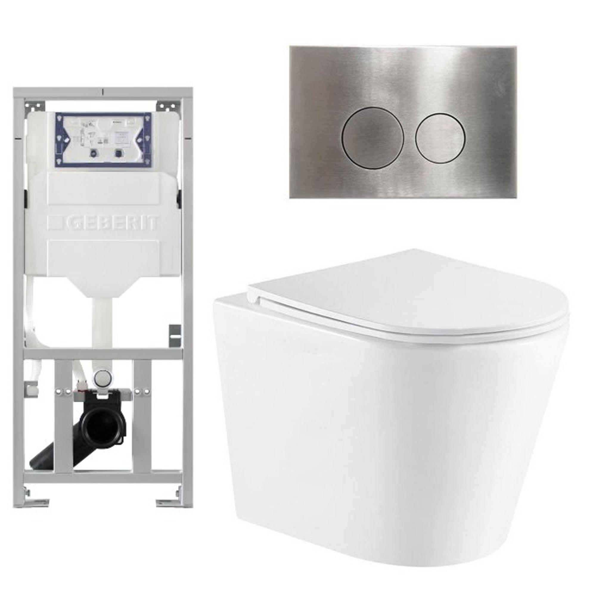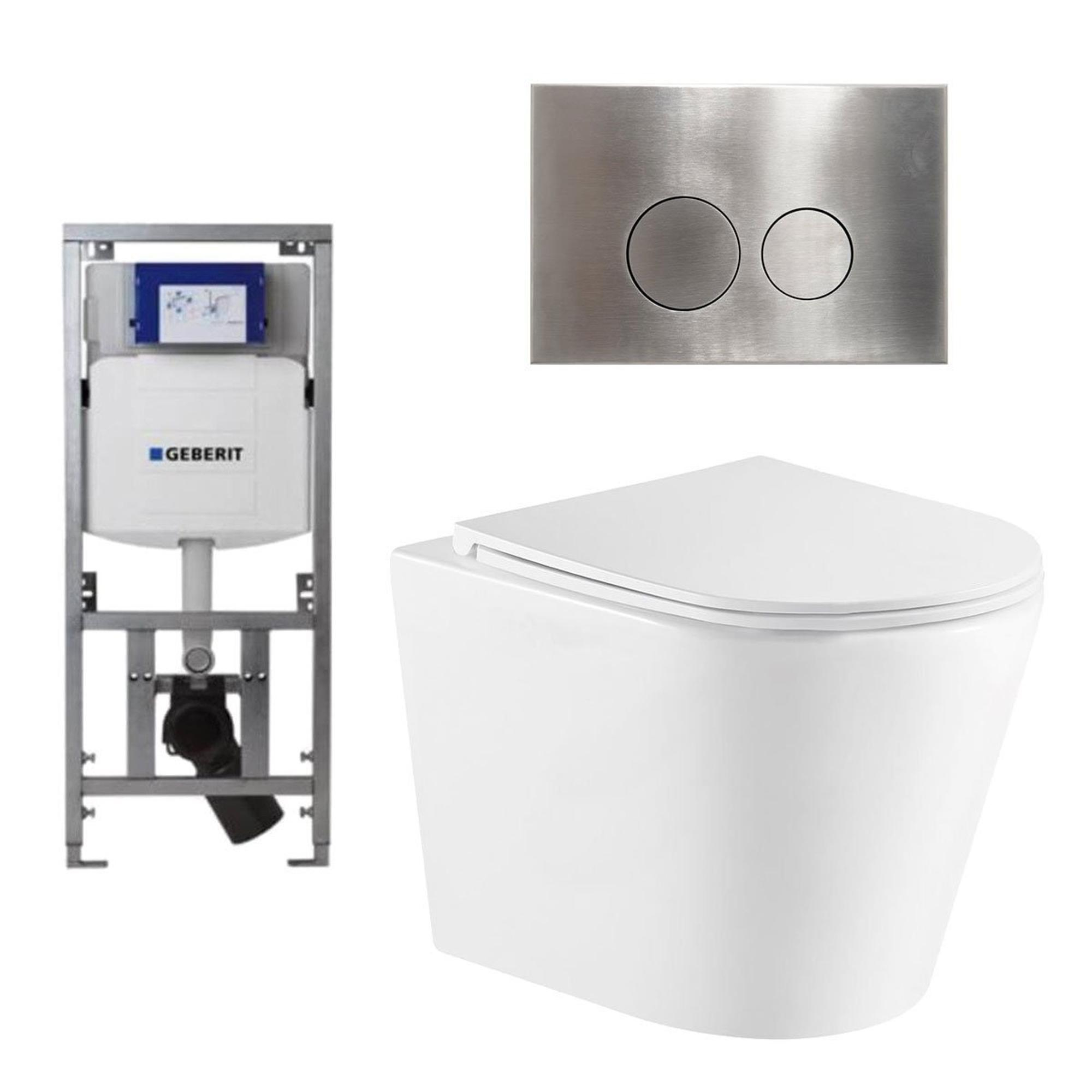 QeramiQ Dely Toiletset - 36.3x51.7cm - diepspoel - rimless - Geberit UP320 inbouwreservoir - softclose toiletzitting - steel bedieningsplaat - ronde knoppen - wit glans