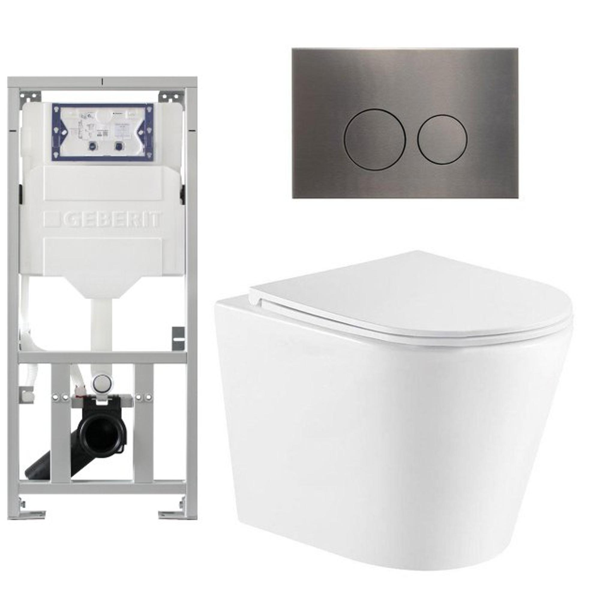 QeramiQ Dely Toiletset - 36.3x51.7cm - diepspoel - rimless - Geberit UP320 inbouwreservoir - softclose toiletzitting - gunmetal bedieningsplaat - ronde knoppen - wit glans