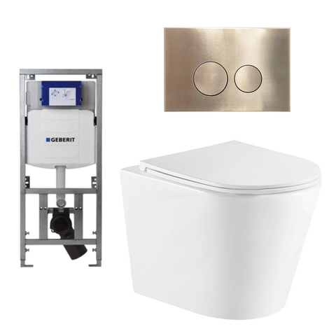 QeramiQ Dely Toiletset - 36.3x51.7cm - diepspoel - rimless - Geberit UP320 inbouwreservoir - softclose toiletzitting - geborsteld messing bedieningsplaat - ronde knoppen - wit glans