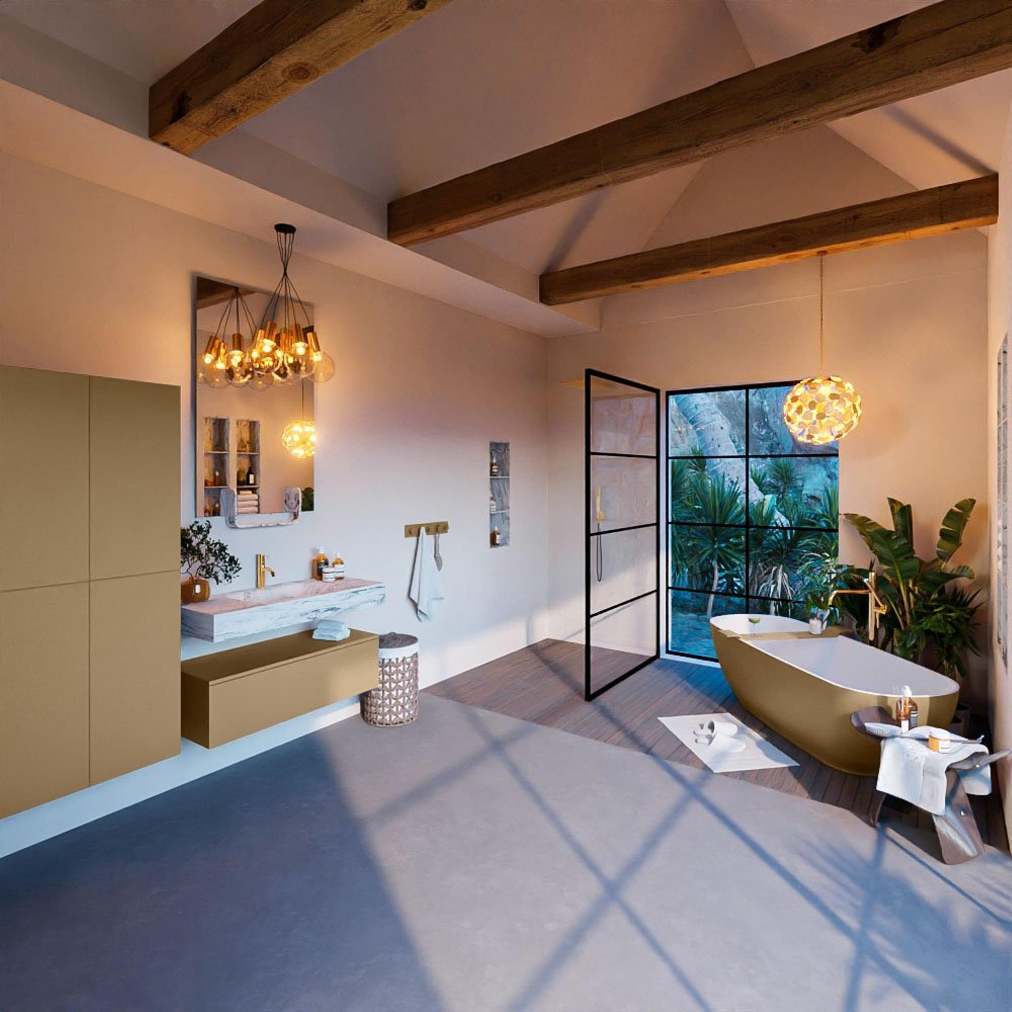 De MONDIAZ ALAN - DLUX badkamermeubelset is ontworpen met oog voor stijl. De Oro kleur en de Glace afwerking zorgen voor een chique uitstraling die moeiteloos past bij verschillende badkamerstijlen. De vrijhangende wastafel en het kraangat in het midden voegen een vleugje moderniteit toe aan het geheel, waardoor dit meubelset een blikvanger wordt in de badkamer.