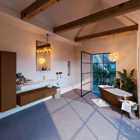 De MONDIAZ ALAN - DLUX badkamermeubelset straalt een moderne en eigentijdse uitstraling uit. De rustieke kleur en het vrijhangende ontwerp geven een gevoel van ruimte en lichtheid aan de badkamer. De strakke lijnen en het kraangat aan de rechterkant zorgen voor een gestroomlijnde look die perfect past bij een eigentijdse inrichting.