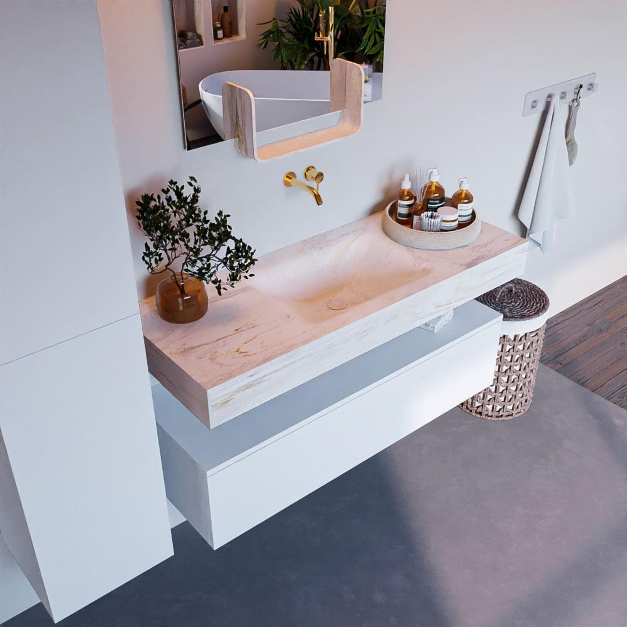 Dit badkamermeubel is niet alleen mooi, maar ook uiterst praktisch. De 120cm breedte biedt voldoende ruimte om al je badkamerspullen georganiseerd op te bergen. Met een handige lade en een vrijhangende wastafel met een middengeplaatste wasbak, is dit meubel ontworpen met het oog op gebruiksgemak en efficiëntie.